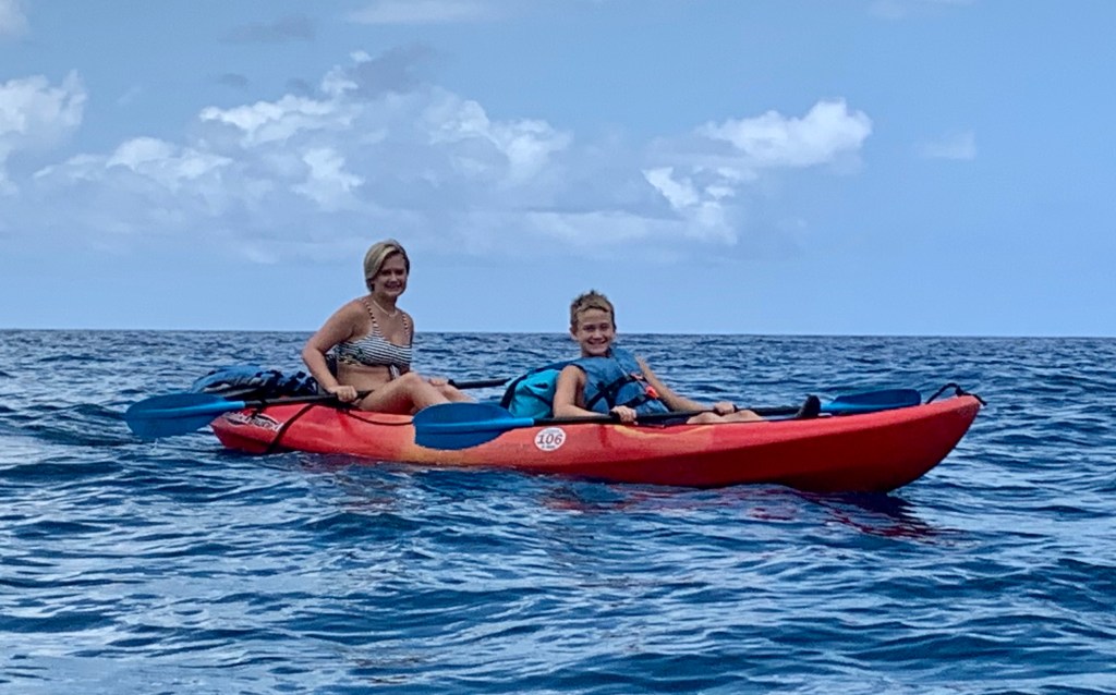 We tethered our 3 kayaks and paddle board together, since you aren’t allowed to land or dock in the bay, and then jumped in the blue inviting waters. Just below us was an entire underwater ecosystem of coral, sea urchins, and dozens of tropical fish. I have begun to understand the allure of snorkeling. It is as if you have stepped into an unseen forbidden world, where you shouldn’t be, and yet you are so entranced by it, that you can’t help but stay. It puts the saying “what lies just below the surface” into an entirely new perspective. I don’t know that all the kids feel the same way though. Sam is mostly bored by it and Abby prefers the more adventurous sports of riding the waves above the water.