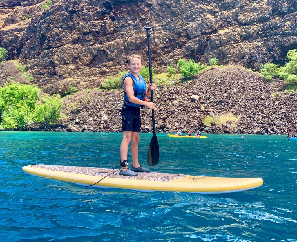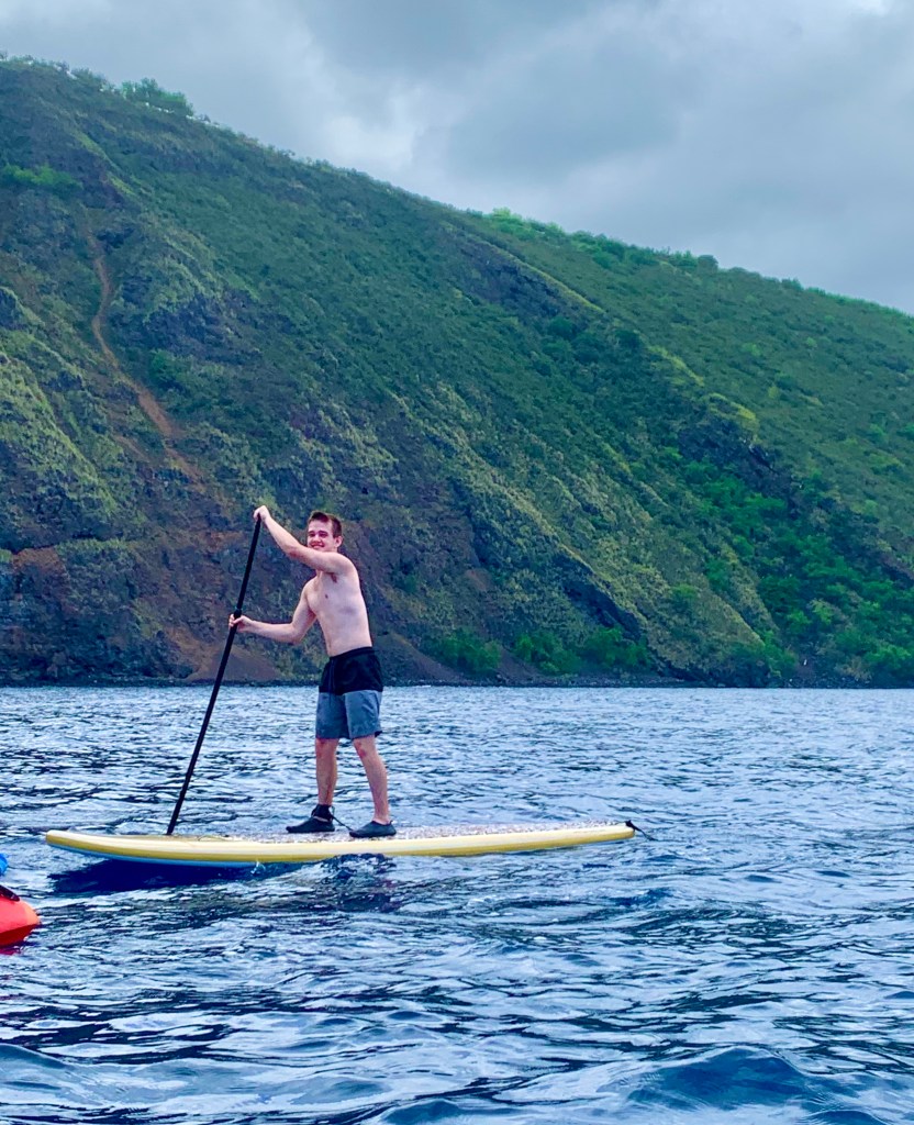 Gabe eagerly jumped on the stand-up paddle board (SUP), although I am not sure he didn’t regret his decision when we finally glided into the pristine snorkeling spot. Kayaking across the bay, the turquoise waters are clear enough to see the coral below us, while in other spots it was a magnificent deep blue as it plummeted into the deep. The lush Hawaiian coastline towered above us off to the right, while the expansive Pacific Ocean stretched out before us to the left.