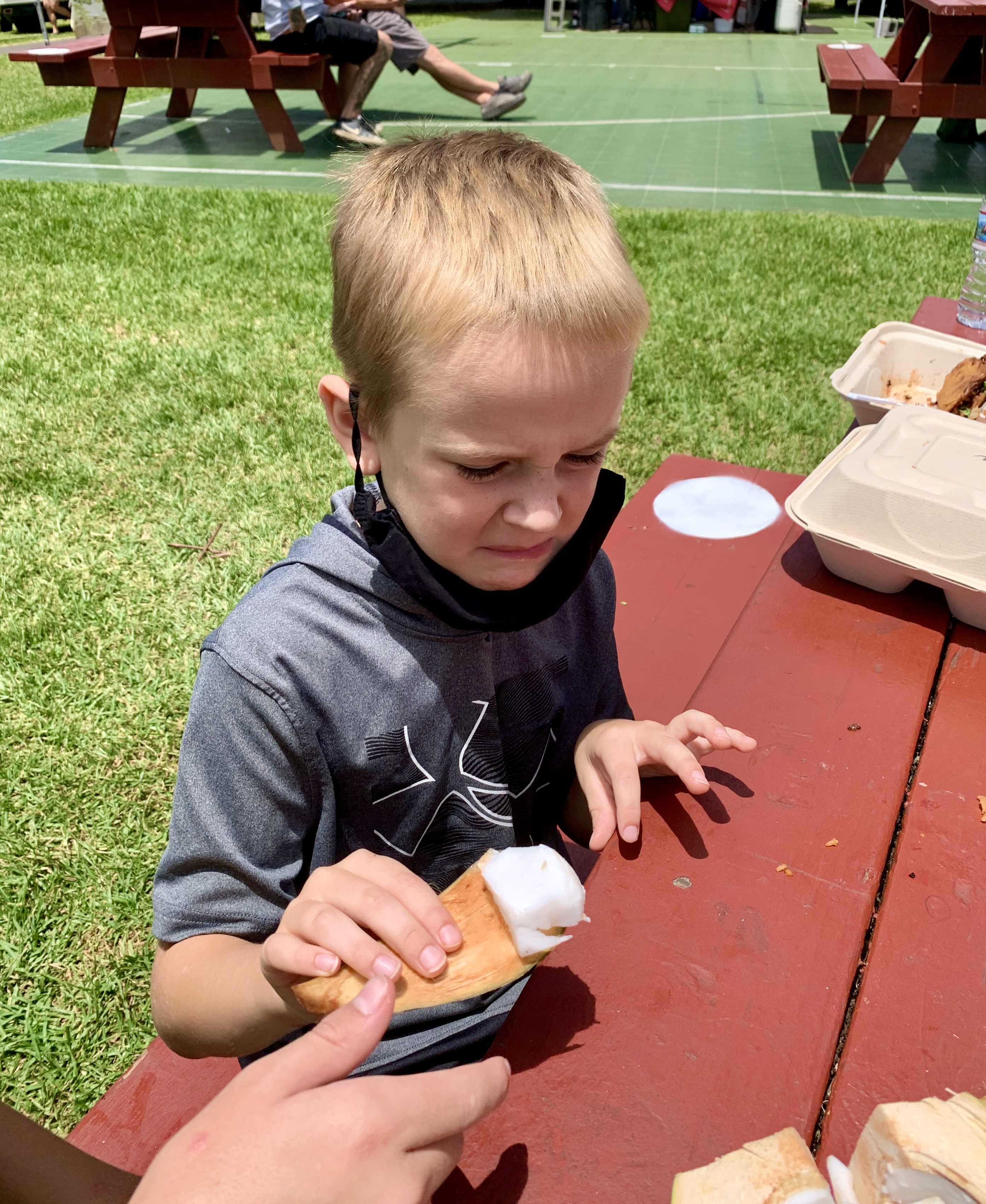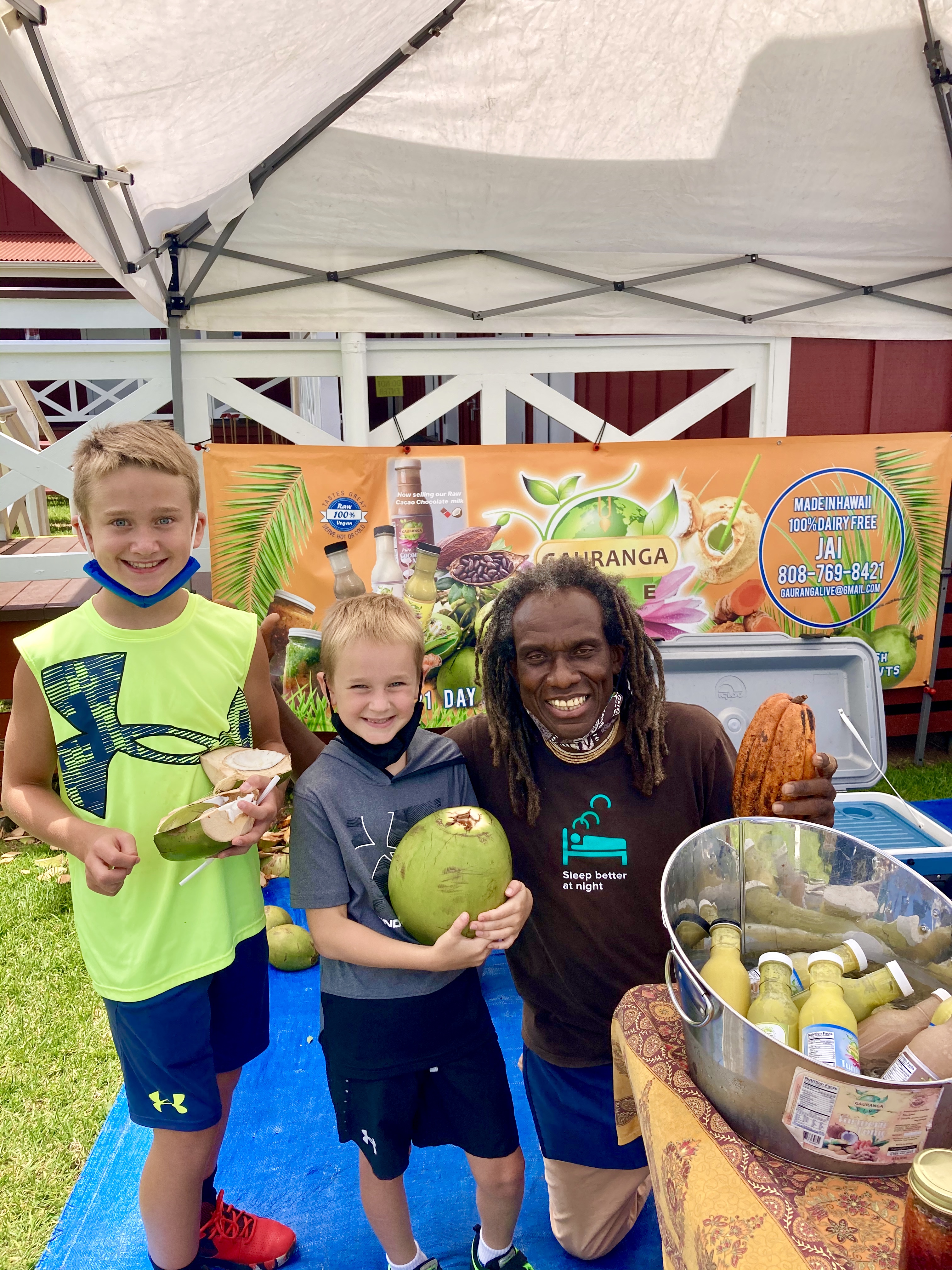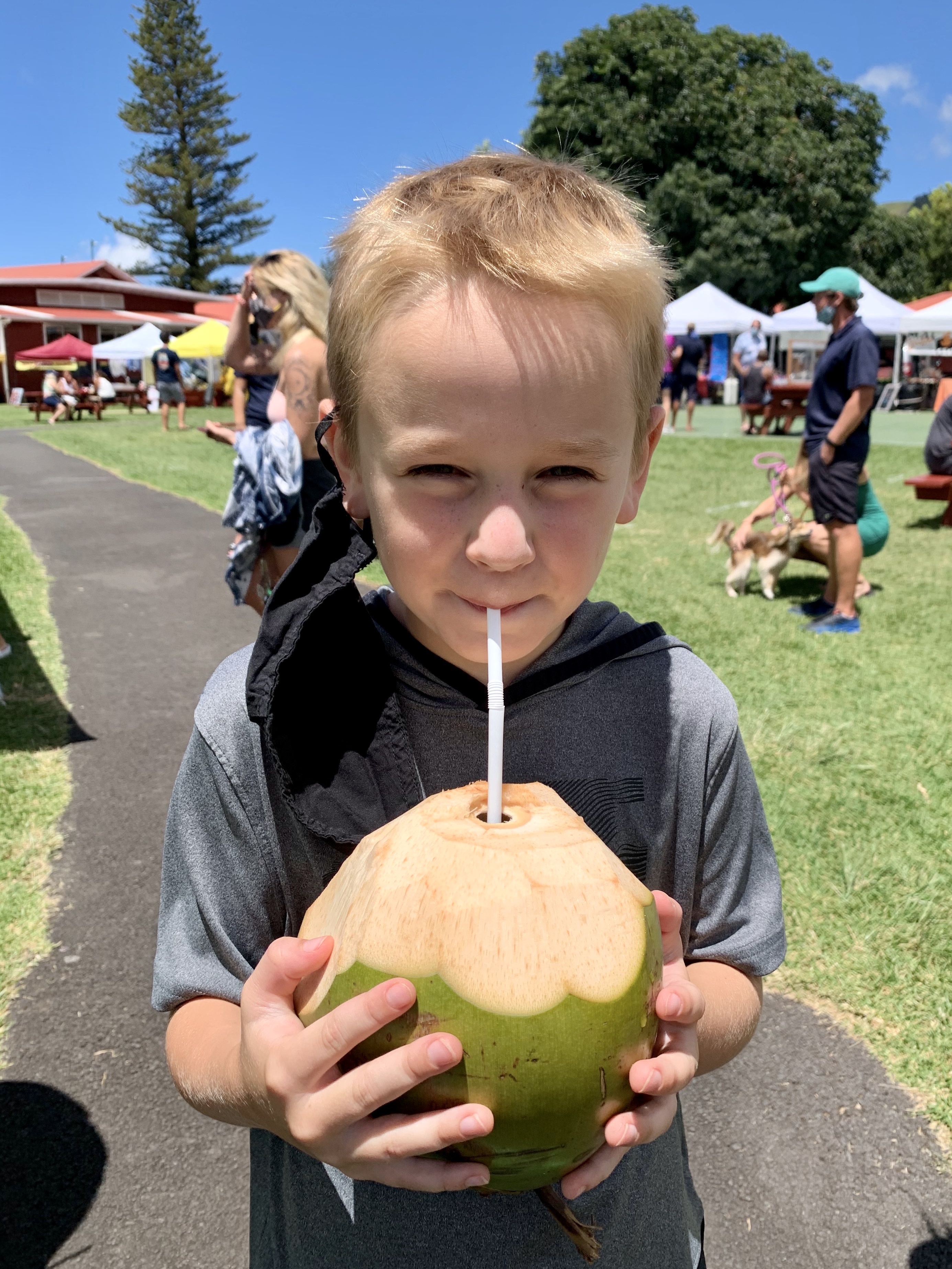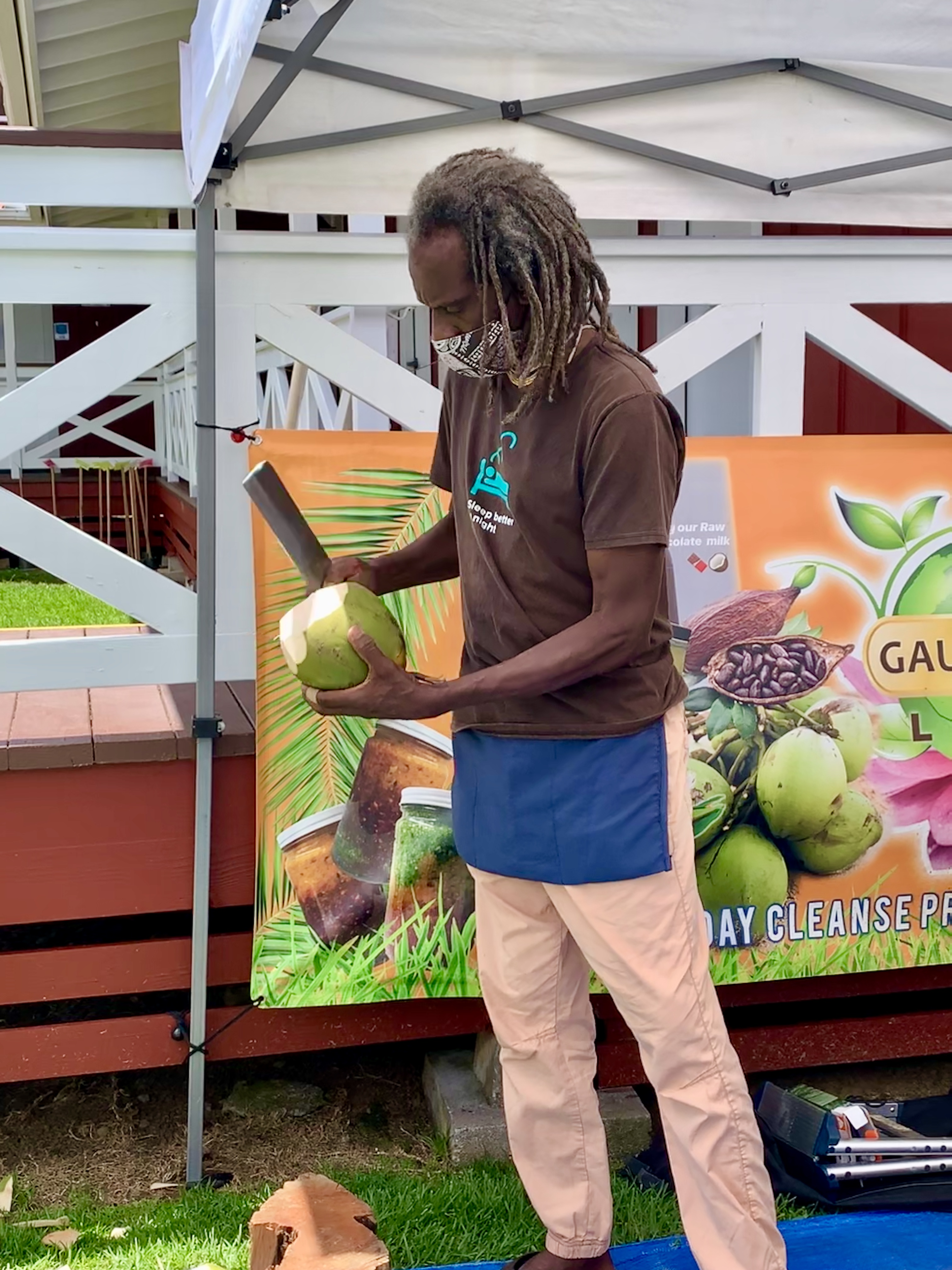 Meanwhile, Sam has been anxious to drink from a coconut since the moment we arrived on the island. I am not sure where this fascination with coconuts has come from, but low and behold, a vendor selling health shakes and tonics is eager to oblige Sam’s request. Jai, a slender gentleman, with shoulder-length dreadlocks and an ivory smile that stretches from ear to ear, reaches down and picks up a heavy green coconut, the size of a cantaloupe. (Did you know coconuts are dangerous? After my extensive research (Google) supposedly over 150 people annually die from falling coconuts worldwide!) With just a few quick precise swipes from his machete, he pops a straw in the top of it, and hands it over to Sam. Much to Sam’s dismay though, his anticipation of sampling coconut milk was not quite met with the actual flavor.