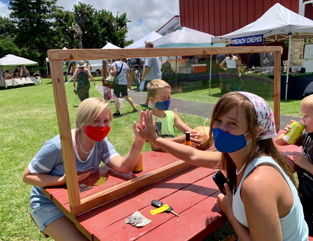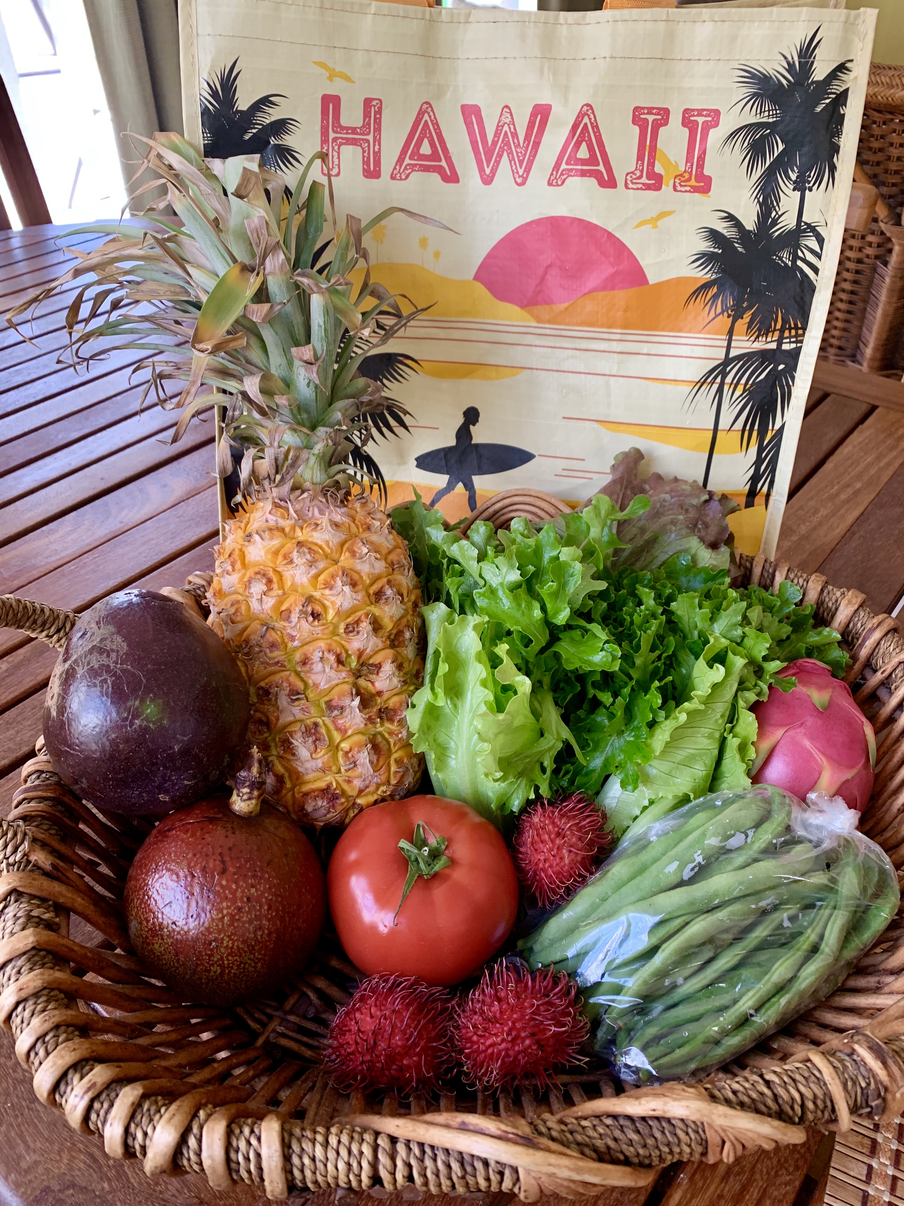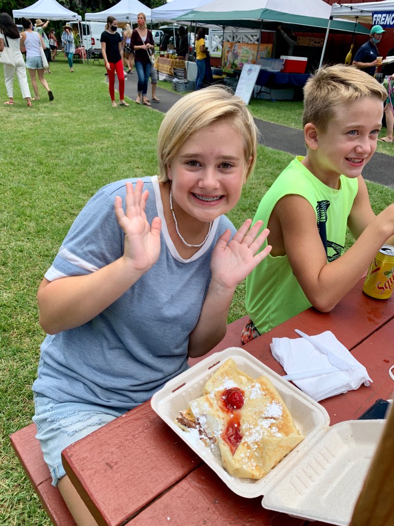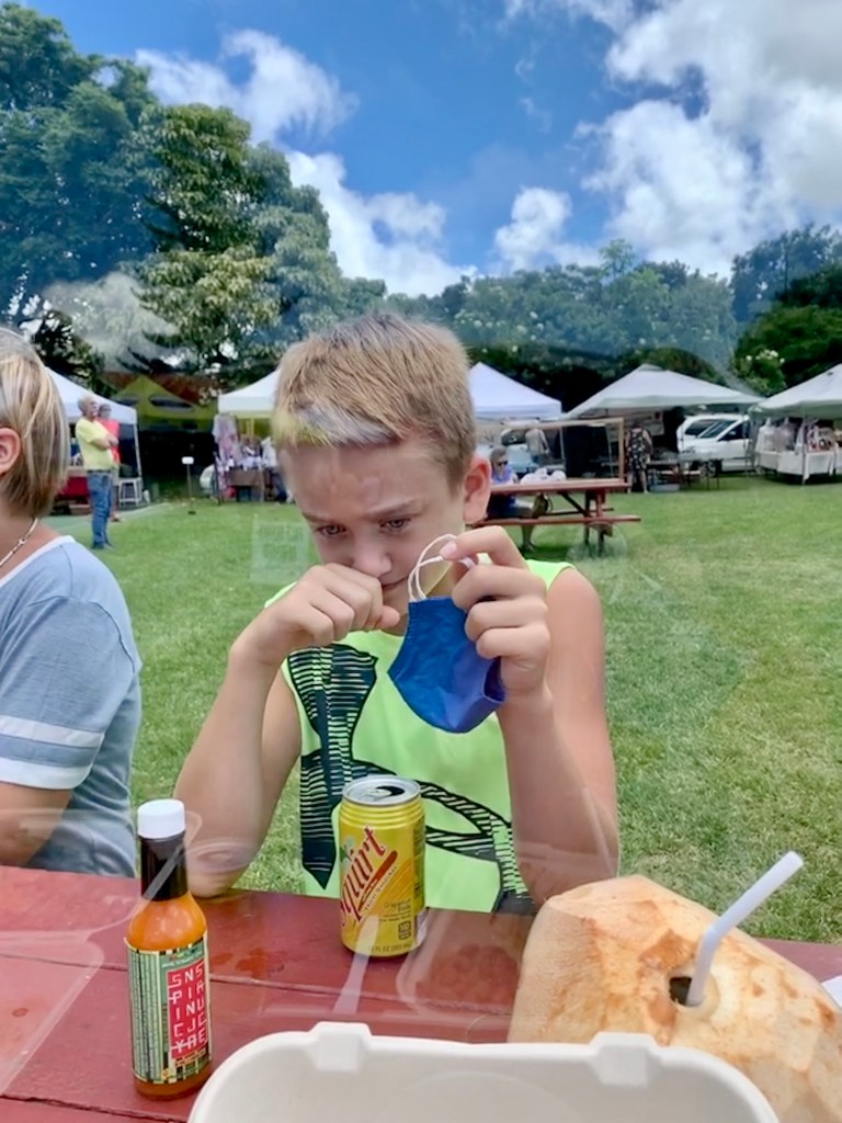 Piling out of our minivan RENTAL (we are STILL waiting for our SUV to arrive) we are surprised to be greeted by a crisp cool breeze; a welcomed relief from the warm, humid Kona air. The Farmer’s Market is gently buzzing with local vendors and farmers showcasing their labors of love to the Saturday morning shoppers: homegrown produce, handmade soaps, breads, hot sauces and salsa, made-to-order crepes, authentic Mexican tacos, and more! The free samplings of smells alone make the visit to the market worth the drive. To top it off, much to our delight we discover an unexpected Saturday customer, quietly hanging out in the trees, trying his best to stay in disguise-a chameleon! We will just add him to our ever growing critter-count here on the island!