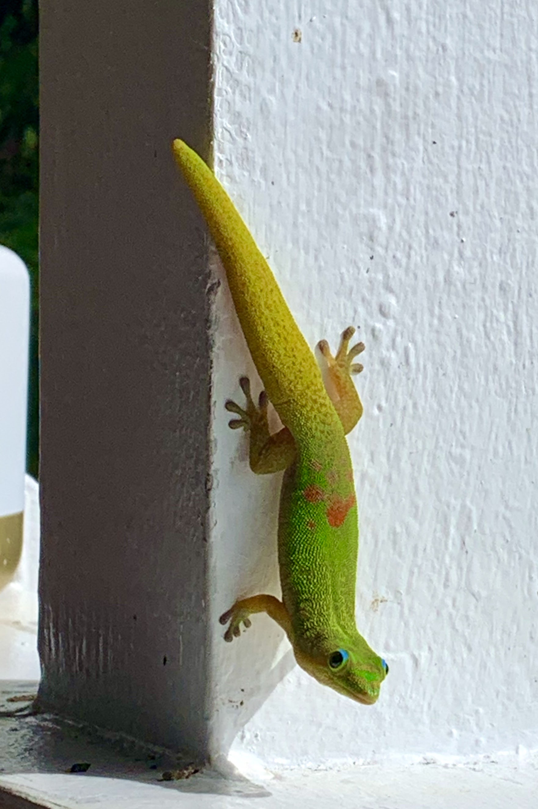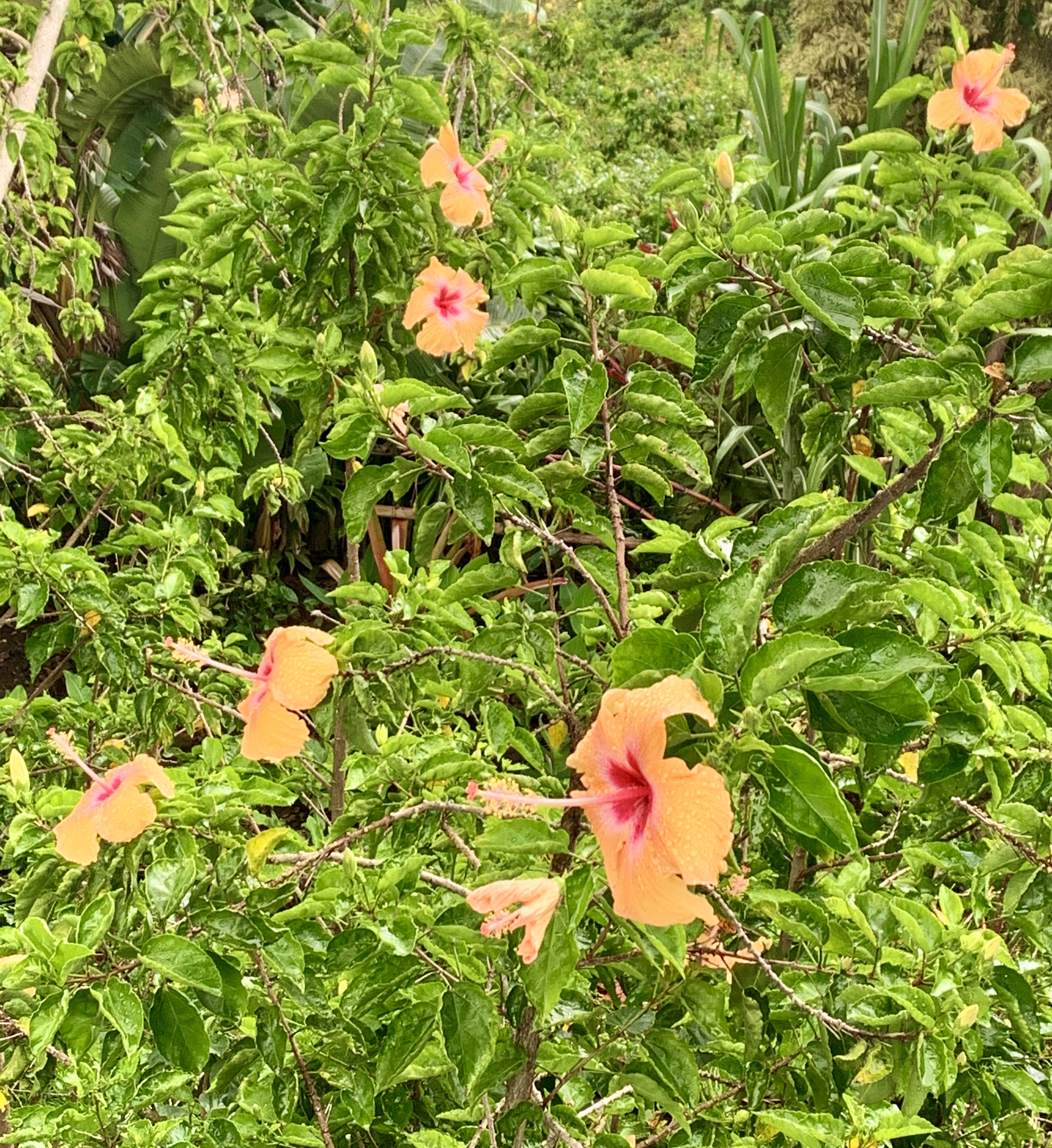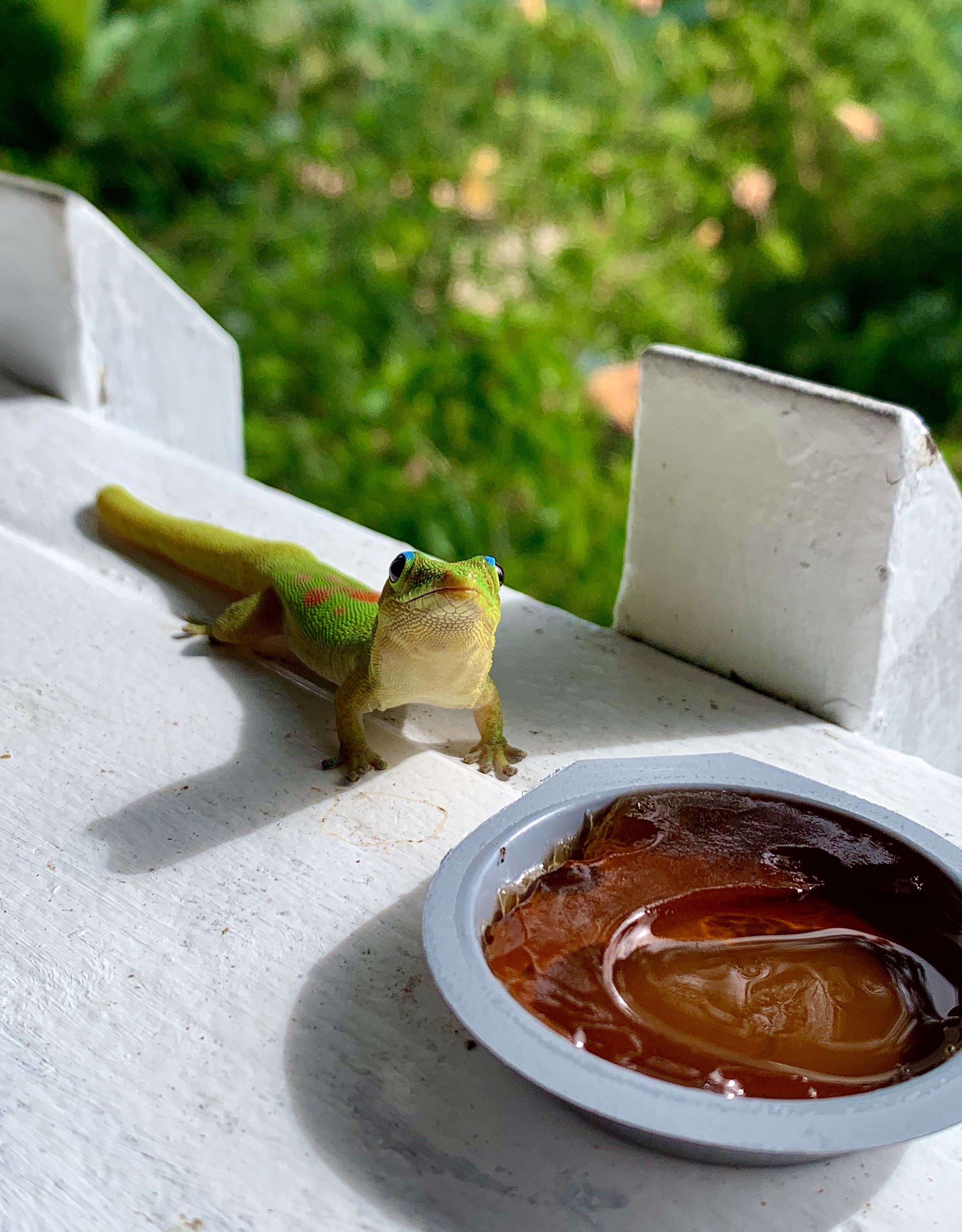 When I hear the saying “a picture is worth a thousand words”, I may forever have this photo etched in my mind, and it doesn’t even do it justice! A light rain had just finished falling; mixing with the gentle salty breeze coming off the water. The brilliant oranges, yellows, and pinks of tropical flowers, sagging slightly under the weight of the raindrops, formed a floral border around the lanai . Geckos raced back and forth across the white painted railings, eating jam that had been specially set out for their dining pleasure.