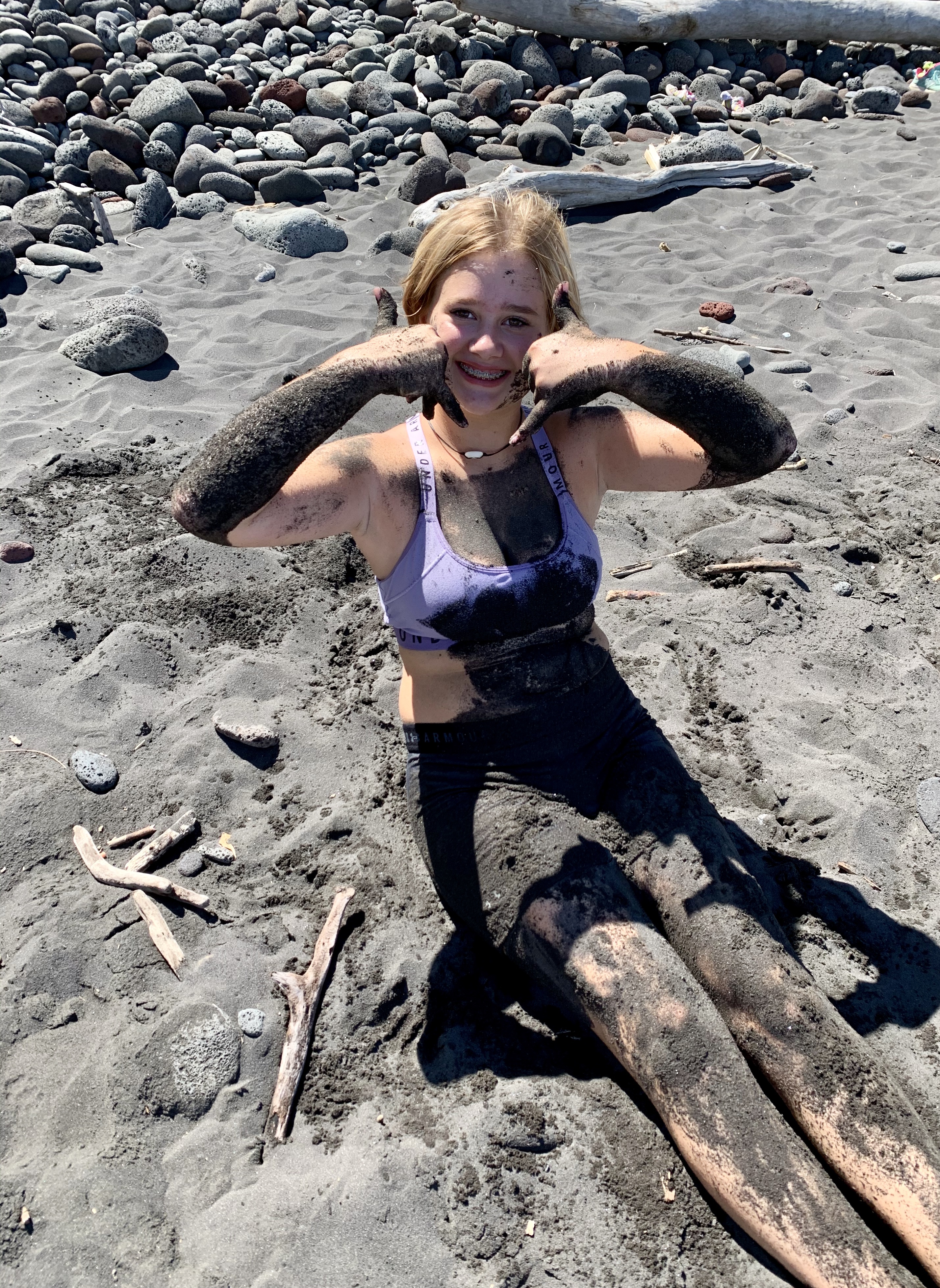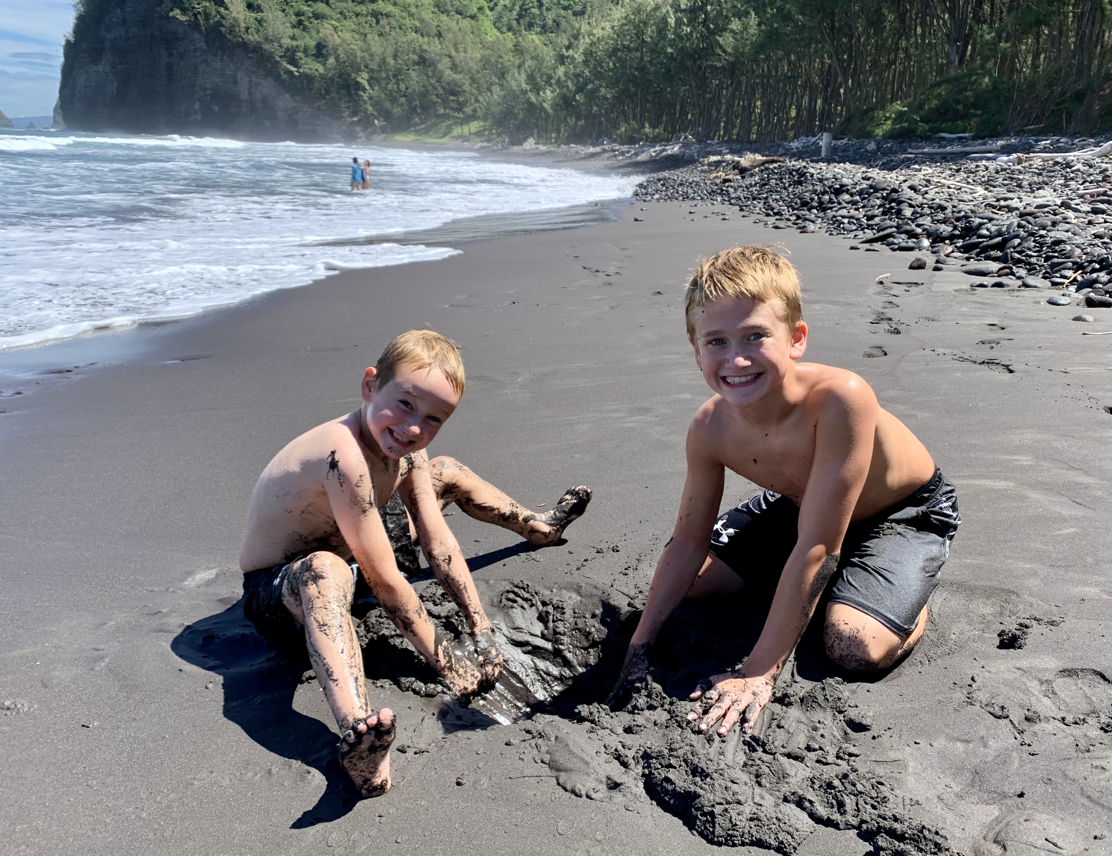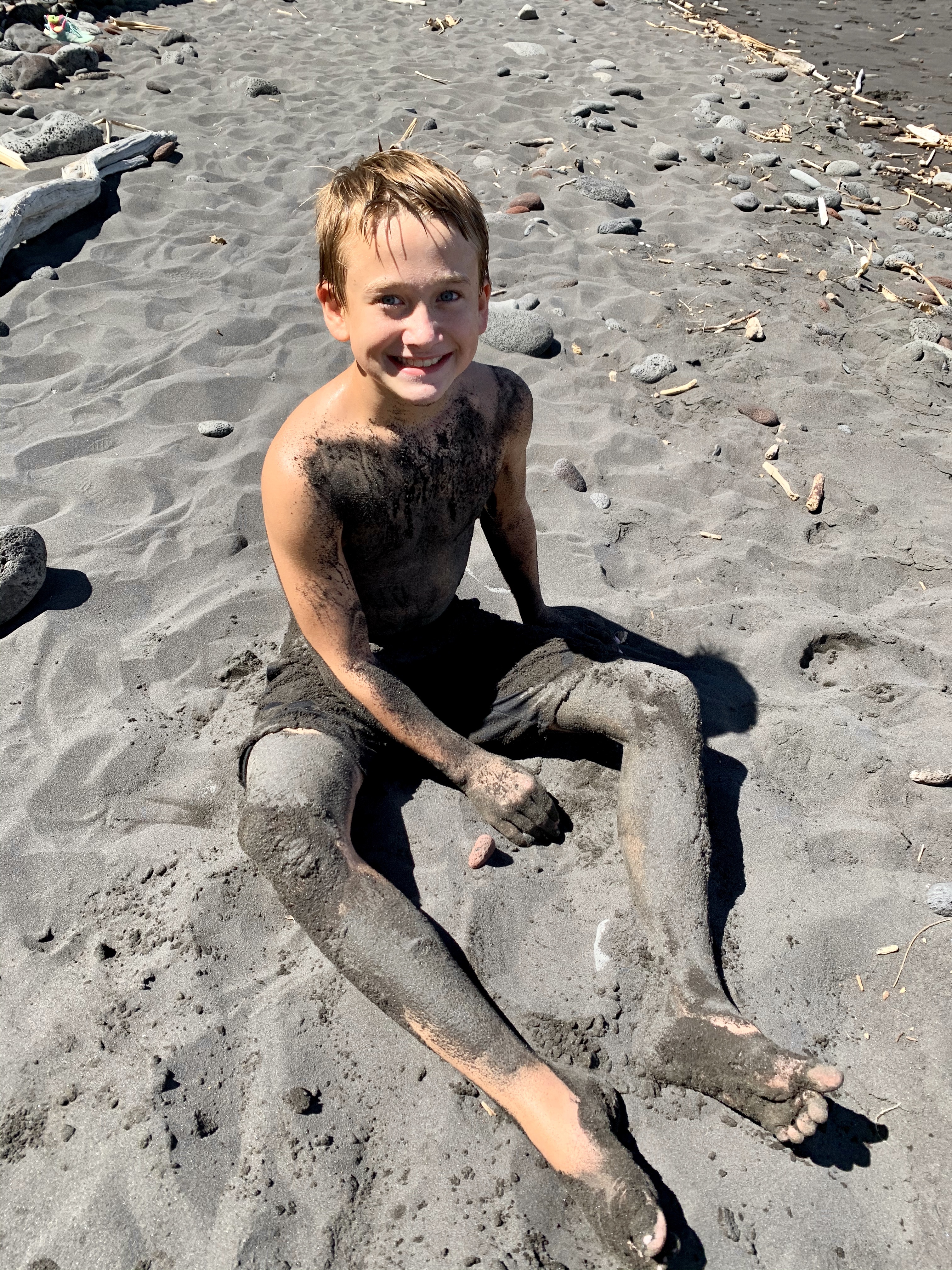 While the thrill of the rope swings enticed a few of my children, the novelty of the black sand beach quickly caught the attention of the others. Much to my surprise, the black onyx sand was soft and fine and glistened in the sunlight. When wet, it’s consistency reminded me of grout, but on my children, it looked as though they had taken a roll in the mud like little piglets!