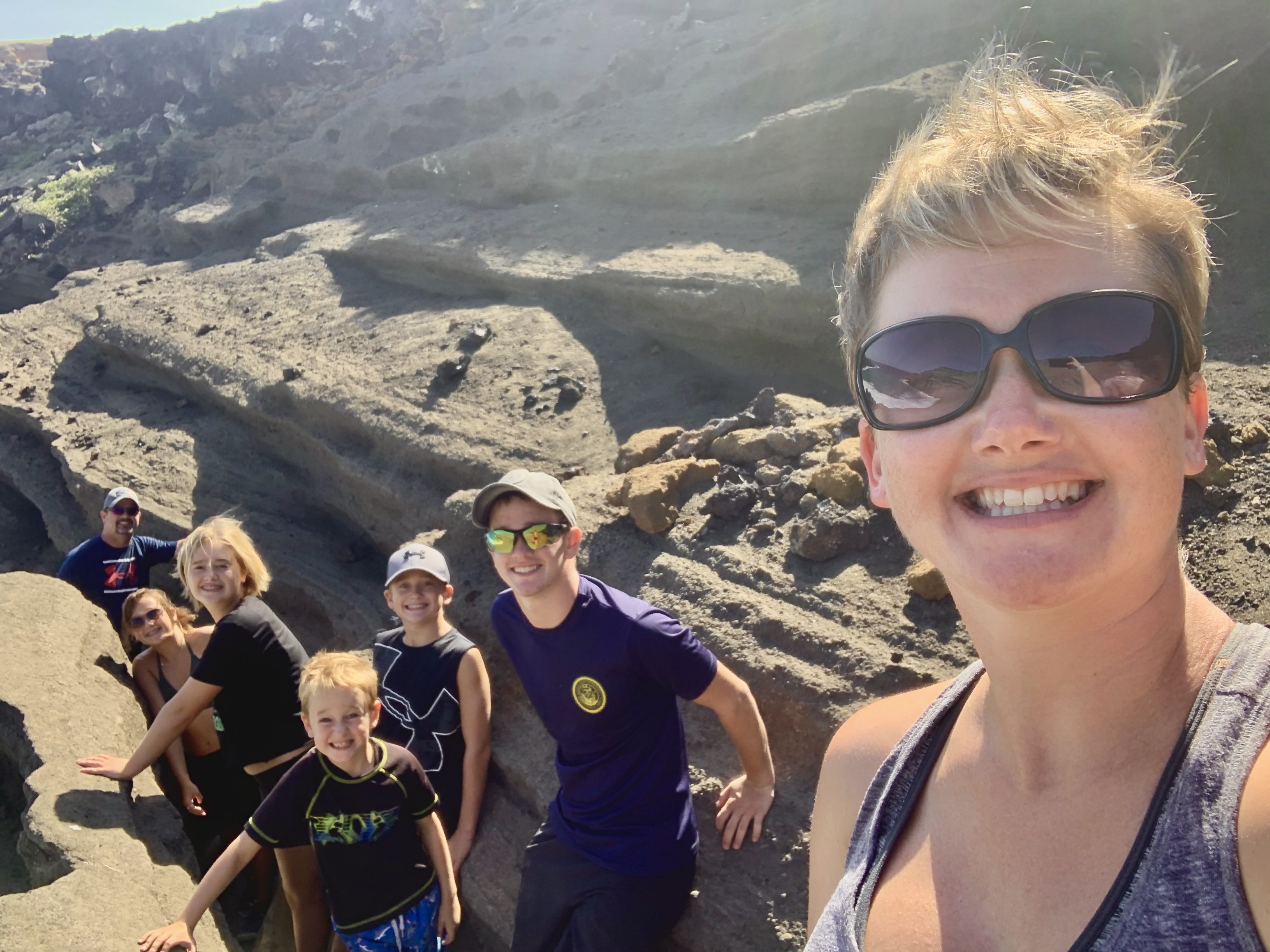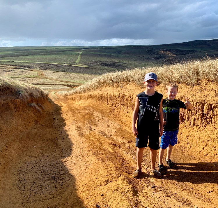 The trails, or more accurately…ruts, are one giant maze, and you feel like you are a mouse trying to figure out how to get to the cheese. The terrain is a mixture of dry grass, red powder dirt, and jagged lava rocks. While distance-wise, it’s only a few miles, it took us a full hour to drive in, as Dave carefully chose which trails he would attempt. You see, we weren’t exactly in an ideal off-roading vehicle. Instead, we were in our “new to us” 2018 Expedition Max (gotta have room for all those kiddos)! Throughout our adventure quest, the kids squealed with delight (and sometimes fear) as Dave meticulously guided us to our once-in-a-lifetime destination.