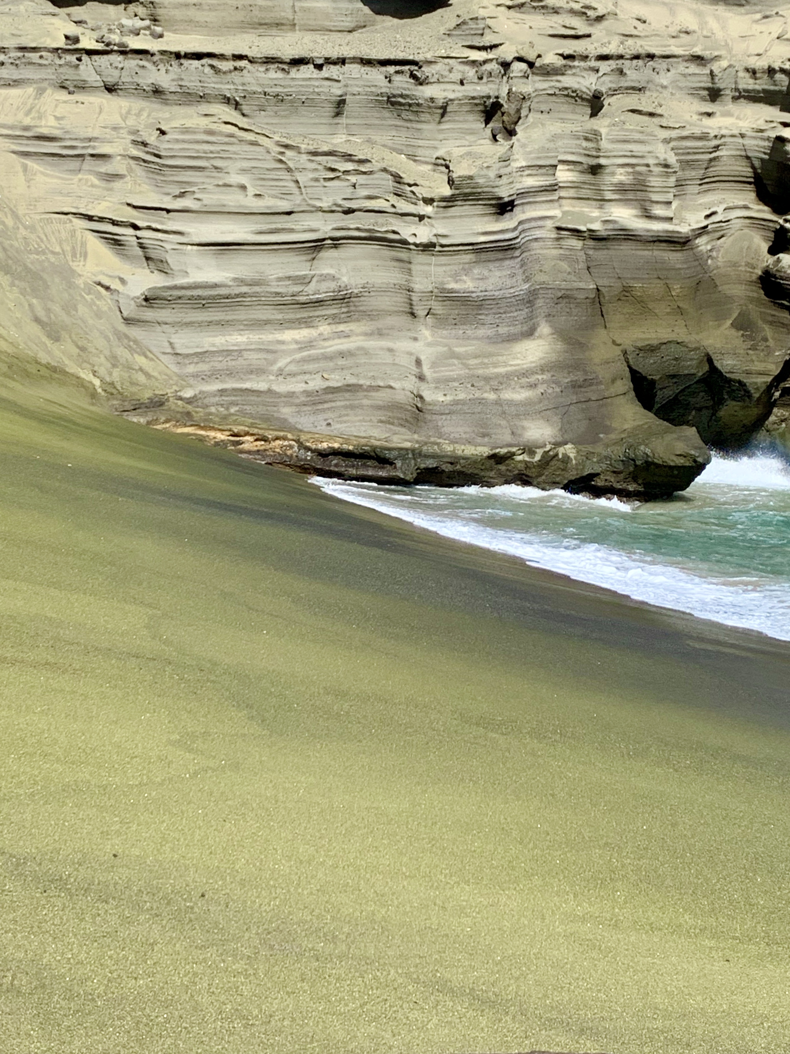 The end of our journey did not disappoint! As we hopped out of our once black, but now dusty red vehicle, we were rewarded with panoramic views of the Pacific and a natural rock amphitheater, welcoming us to Green Sands. As we sat at the weather-worn picnic table, eating our homemade chicken salad, we marveled at the peculiar seascape as the turquoise waters crashed against the glittering olive beach. Climbing down to the water’s edge proved a fun adventure in itself as we carefully negotiated through the cliff walls, down a sea worn ladder, and finally to crystal sand. Between the combination of the remoteness of the beach and the volatileness of the surf, we errored on the side of caution and did not dare to venture out. Instead, we soaked up the scenery and the warm tropical sunshine, while Sam built a green sandcastle.