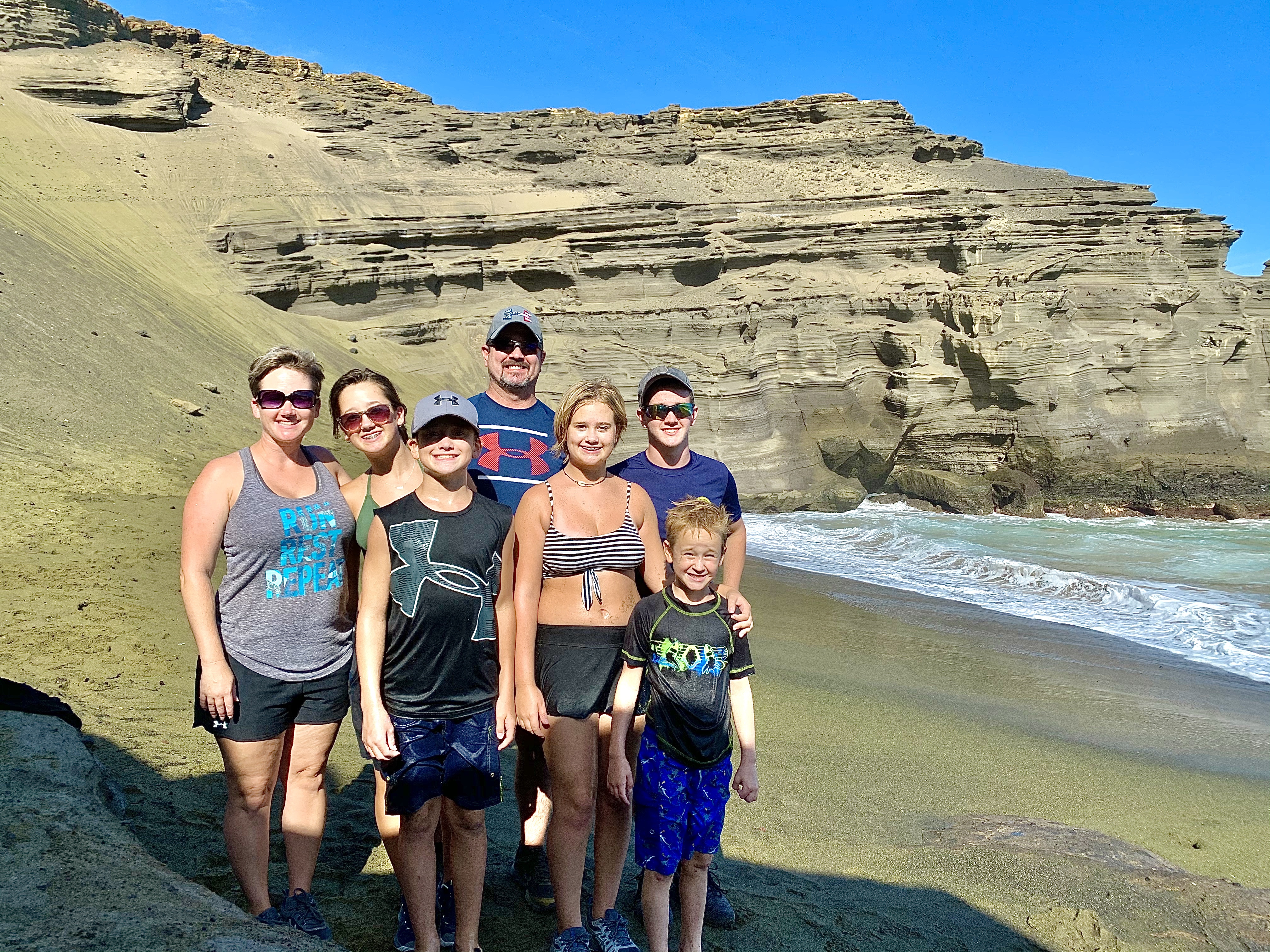 Green Sands Beach, also known as Papakolea or Mahana Beach, (lots of places in Hawaii have numerous different names) has been at the top of our Cunningham-Must-Do-List since we arrived on the Big Island two months ago. However, I’ll be honest, it was giving me anxiety at the thought of trying to navigate there and back (and by that, I mean be the side-seat driver while Dave did the navigating). You see, Green Sands is not conveniently located directly off a smooth, blacktop finished two-lane highway. No. You have to work to get out to this beach AND take a few risks along the way.