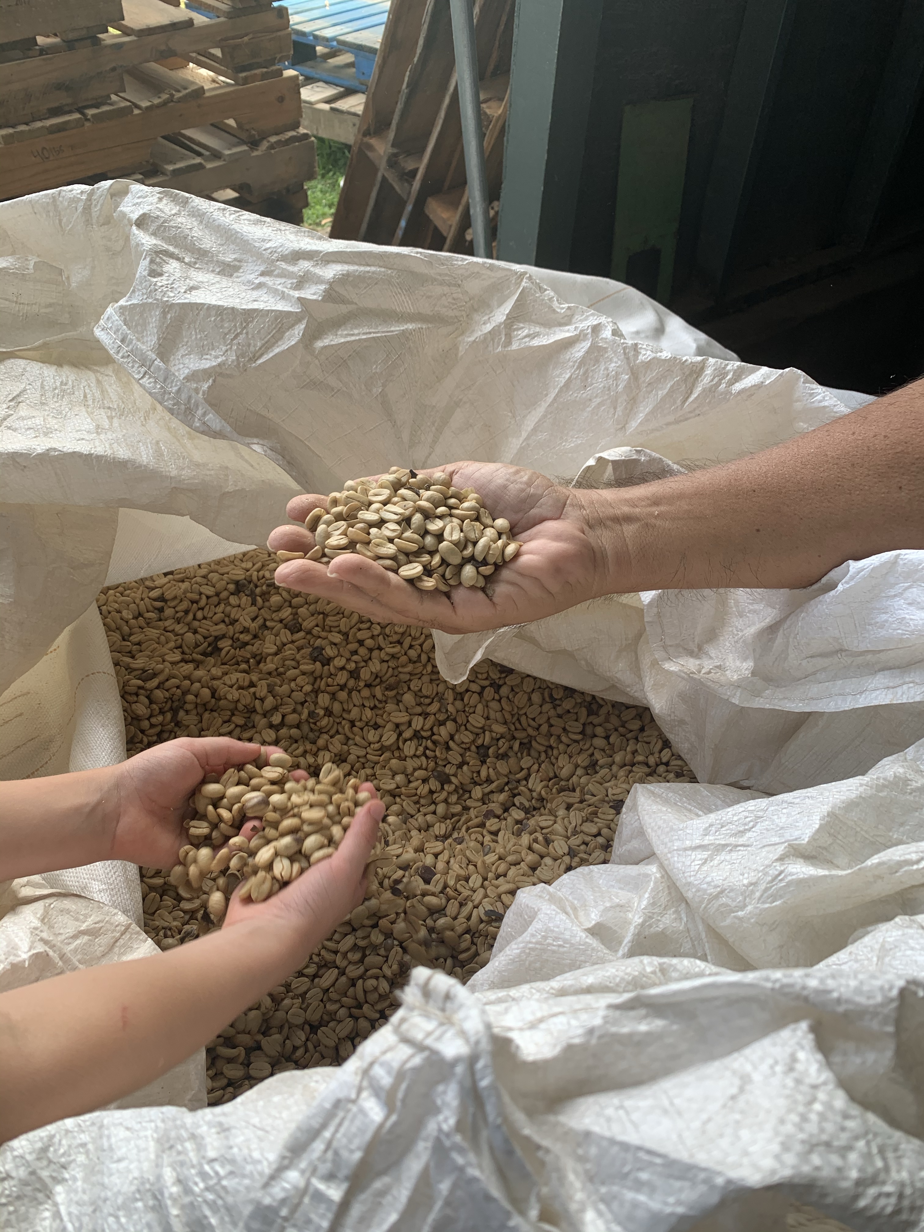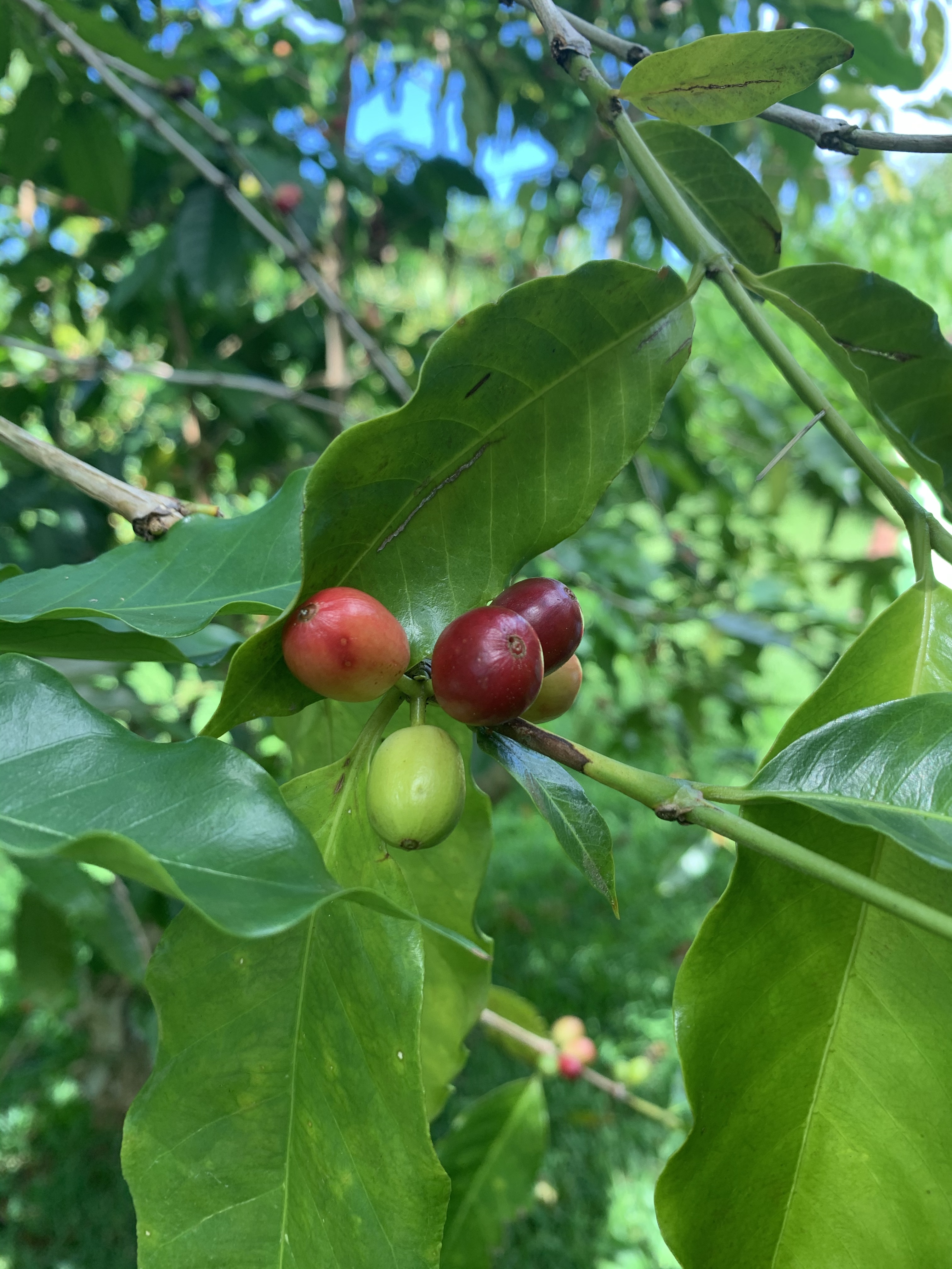 Coffee cherries ripen in several rounds throughout the year. On large coffee farms, a machine strips the branch of cherries once a season. However, at Greenwell, each cherry is tenderly handpicked, leaving the green ones to be plucked another day. Each tree will yield about 1-2 pounds of roasted coffee every year. While that doesnβt sound like much, keep in perspective that it takes about 2,000 cherries to make 1 pound of roasted coffee! In addition, about 1/3 of the cherries are ruined each season by a menacing little beetle, the coffee borer beetle. No larger than a pinhead of a needle, it bores its way into the center of the fruit, where it lays its eggs and ruins the cherry.