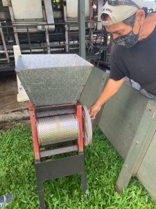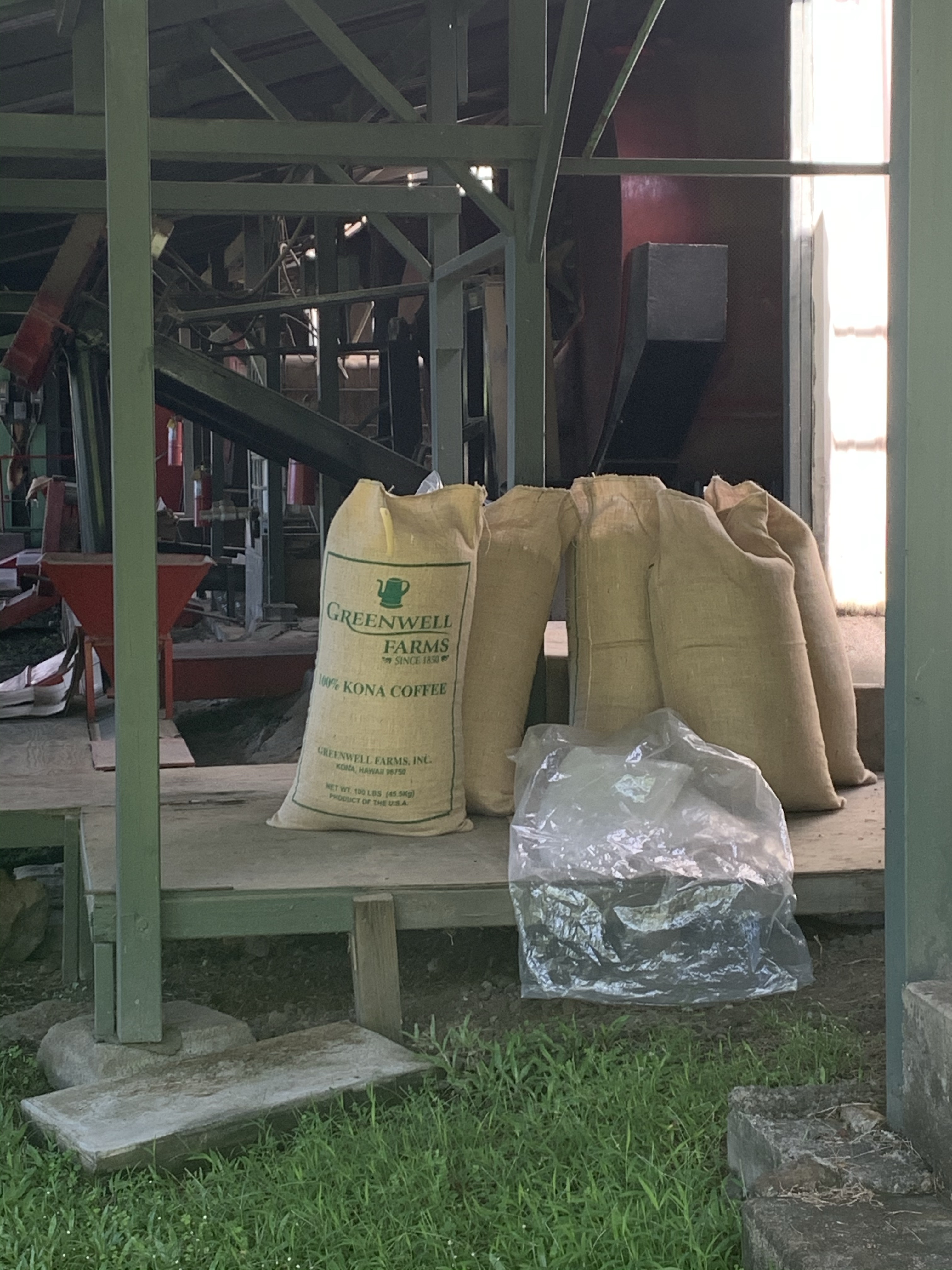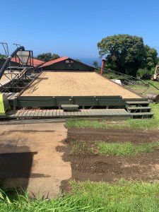 The dry mill is the next stop for the seeds. Here they are hulled and separated into sizes and grades. The dried coffee beans are finally placed into 100-lb bags, where they await inspection by Hawaii Department of Agriculture.