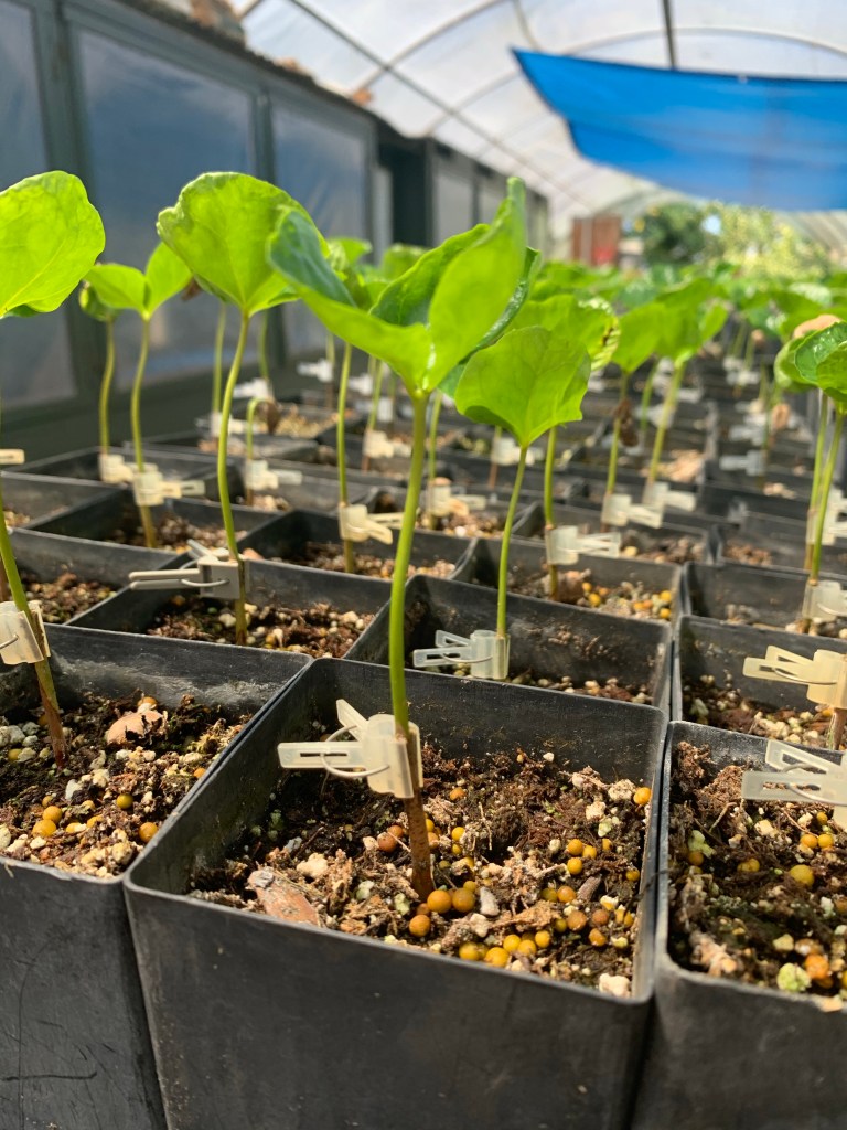 Hereβs What We Learned: At Greenwell Farms they graft two different types of coffee plants together to create a seedling with a strong, insect-resistant trunk that also maintains the distinctive Kona coffee flavor. This is a painstaking process and takes surgical precision. The hybrids will hang out in the nursery for about a year before they are transplanted into the orchards. It will then take three to four years before the plants produce their first harvest.