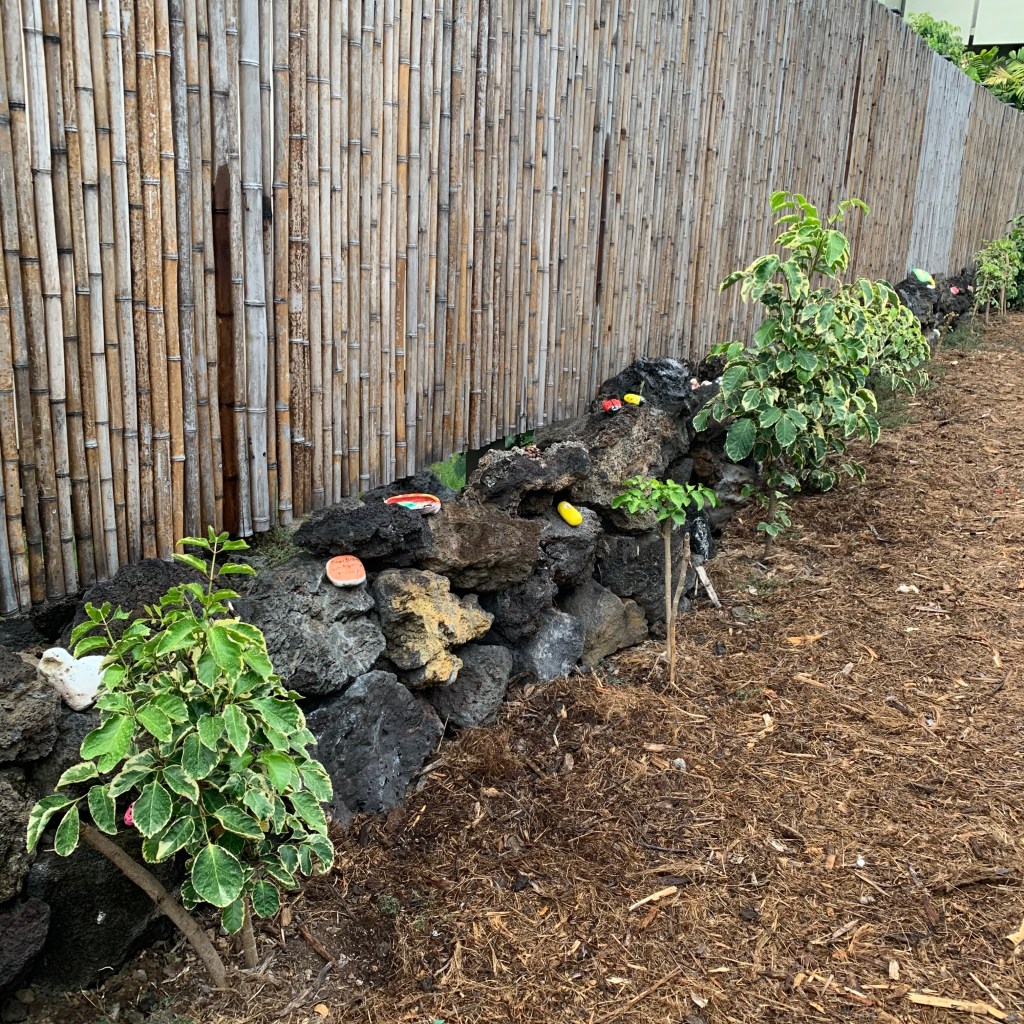 Our walk to the beach leads us down a quiet road, graced with fragrant white plumeria trees on one side, and a large banyan tree, whose roots drip down from its branches, on the other. Just around the bend in the road, a little alley finds itself nestled between two tall bamboo fences. The walkway itself is lined with mulch and the ever abundant porous lava rocks. But the most endearing quality of the little pathway is the hand painted rocks that decorate its entire length. One of the kids’ favorite things to do is to scout out new additions to the collection of lovingly painted rocks, coral, and shells.