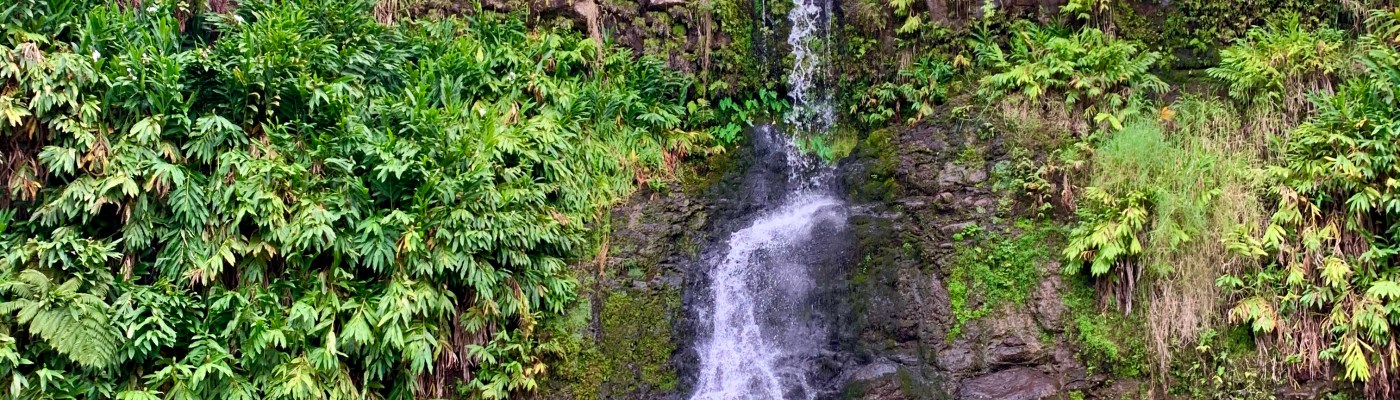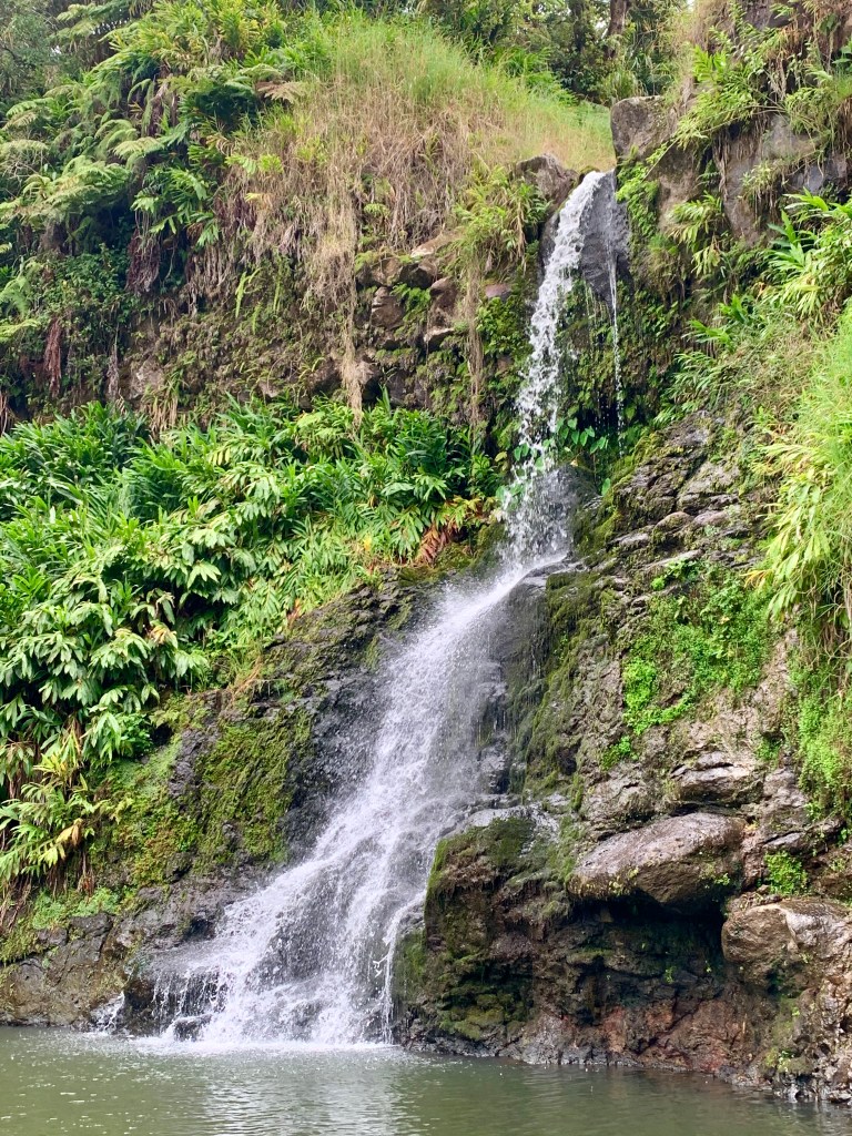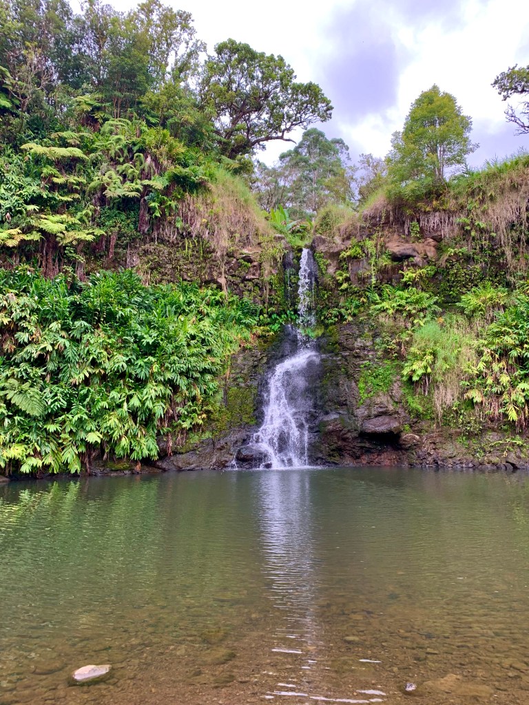 30 minutes in and I am starting to get a little concerned. Were we supposed to turn down a different path? Was it left at the teal car or straight? At this point in time, I resign to owning what I think may have been a bad decision. And in that exact moment the woodlands begin to thin and Waipi’o Valley reveals itself in the distant backdrop. (Insert sigh of relief). As we draw nearer to the clearing, the faint sound of rushing waters gently hums in our ears. Almost hidden amongst the overgrown grasses, a worn set of dirt and wooden plank stairs lead us down into a hollow. Steep rocky cliffs rise above us as a steadily flowing stream gushes over the side, tumbling into a freshwater basin.