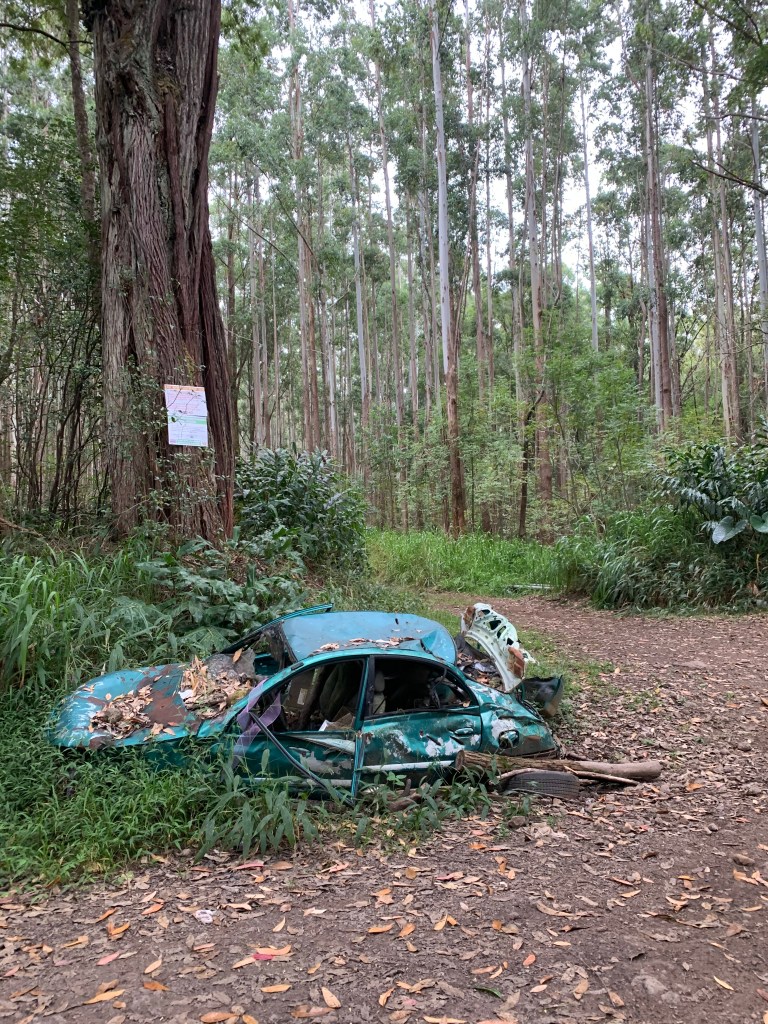 Hike is too strenuous of a word to describe this leisurely stroll through the woods. With towering eucalyptus trees framing either side of the pavement, the drive to the trailhead is almost poetic (until you’re jarred by the first pothole). Admittedly, I may have been a little more skeptical as we began to pass old tires and abandoned cars if I hadn’t already been forewarned. As we park our SUV, which is receiving some heavy use thanks to our adventuring, I stow away our valuables and say a quick prayer in hopes that our vehicle will be in the same condition when we return.