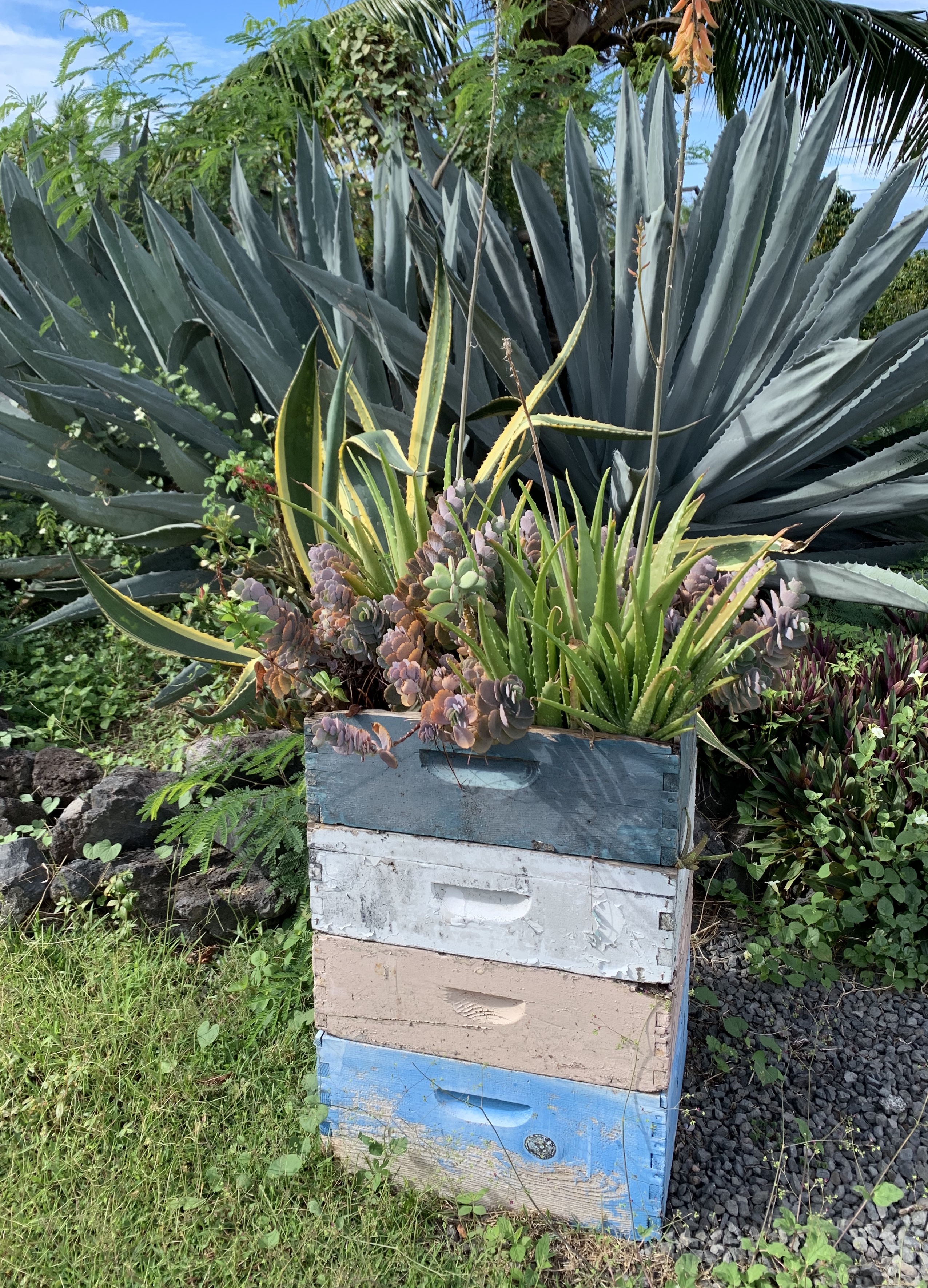 Arriving at Big Island Bees for our reservation, we are greeted with a wooden serving tray full of honey caramel macadamia nut tarts and tea. We are encouraged to have a seat at one of the nearby brightly painted picnic tables and enjoy our samplings while we wait for our tour to begin. The grounds are quaint, complete with what appears to be a broken down old flat bed truck still loaded down with beehive boxes. The peaceful little farm is framed by tropical blooms and prehistoric looking agave plants contrasting against the blue backdrop of the Pacific Ocean.