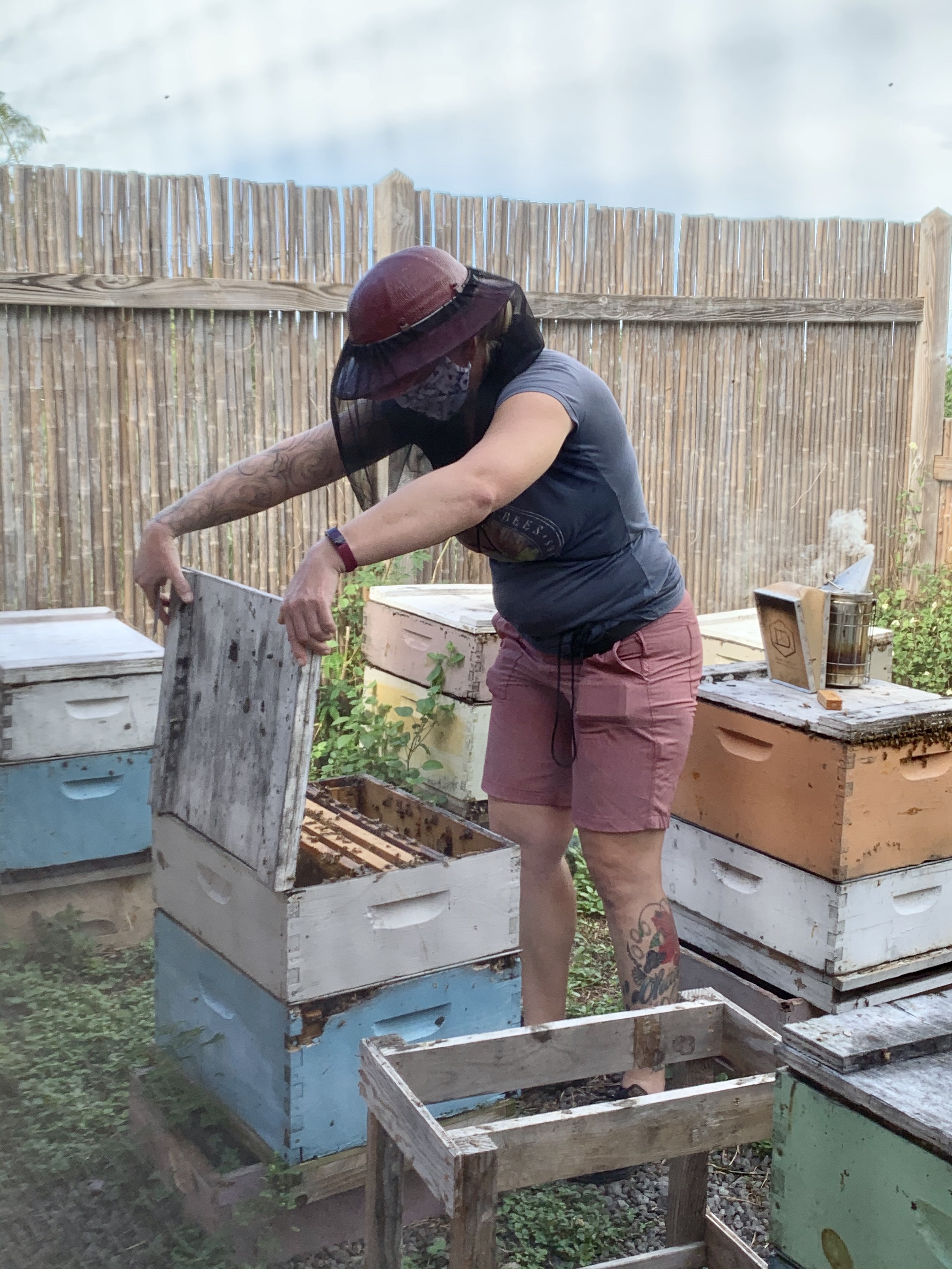 Crossing the lawn, we are escorted to an L-shaped outbuilding with giant screened windows, where a small apiary (bee yard) lies in the center. Armed with only her uncapping knife (used for prying open the lids), smoker, and beekeeping veil, she enters into the bees domain without hesitation. She quickly selects a beehive to inspect and gets to work.