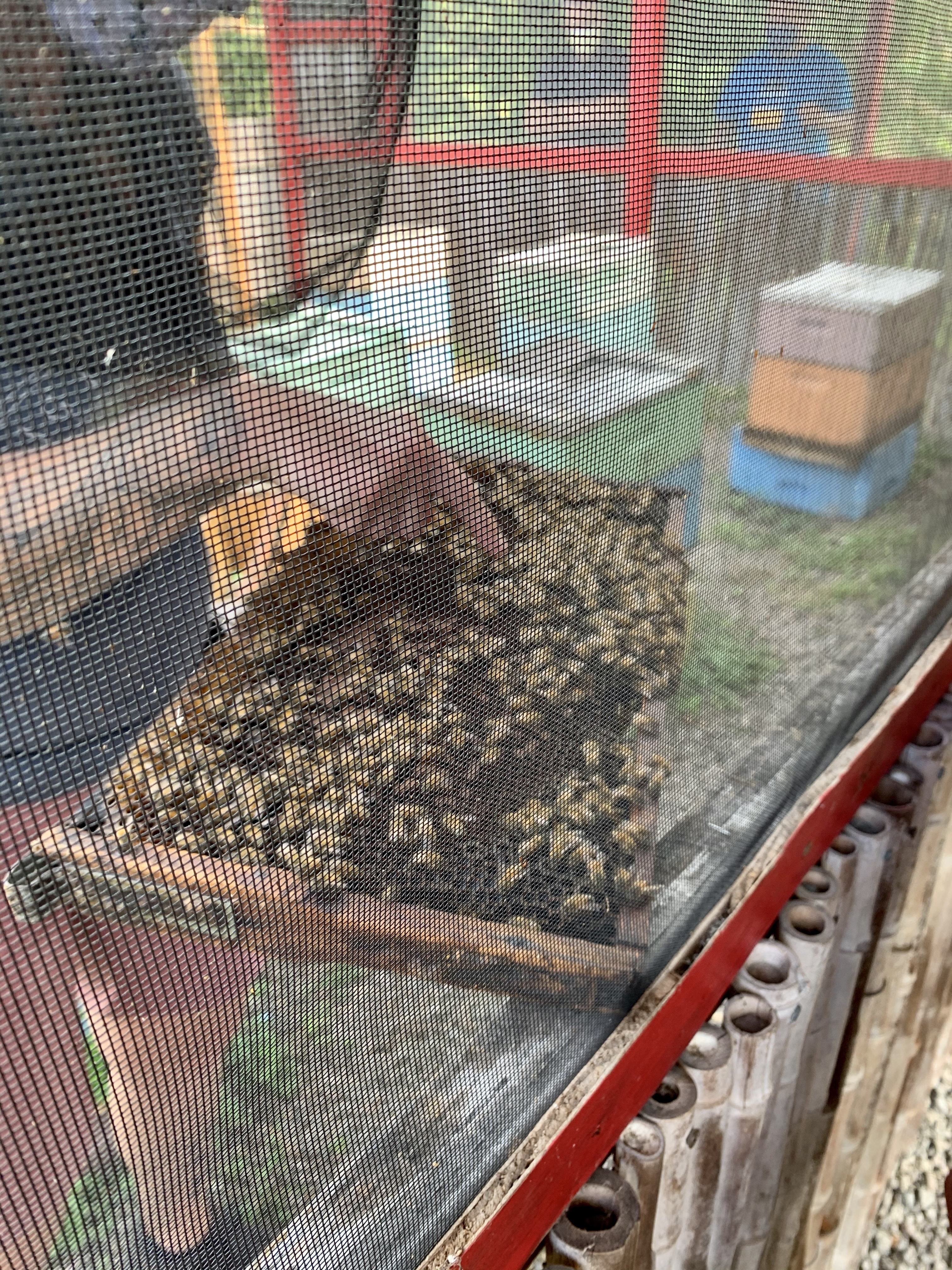 Soon enough our tour guide for the morning, Lisa, calls us over to a viewing room to watch a short presentation on the process of Hawaiian honey production. Before entering though, a bunch of overripe bananas hanging from a rope catch my eye. Leaning in closer, it becomes evident the bananas are a treat for certain little guests who have quite the sweet tooth !