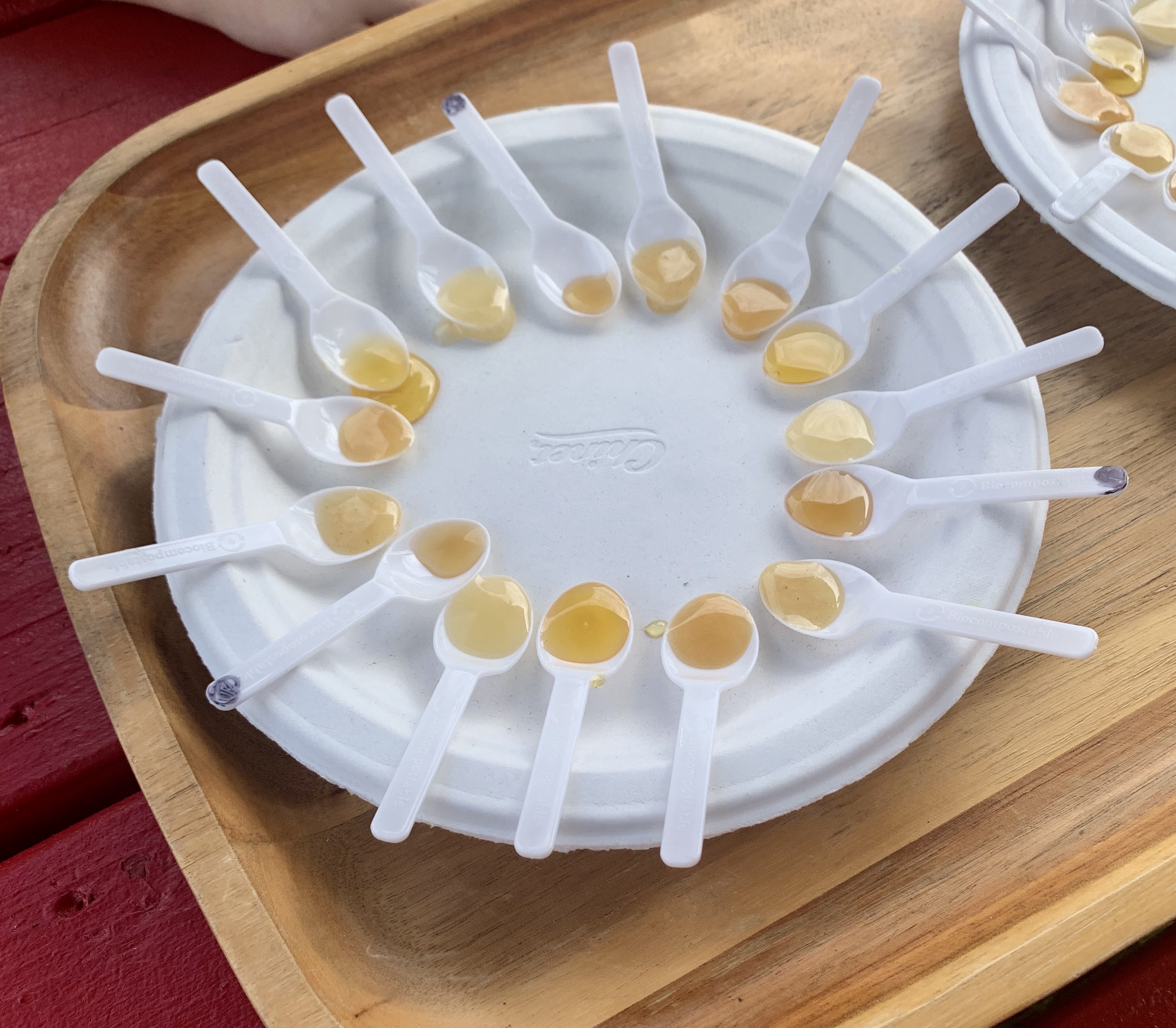 After concluding her welfare check and once all our questions have been exhausted, we once again head over to the picnic area. This time we are surprised with a plate full of tiny spoons, each with a different type of honey to sample. As we savor the flavor of each honey we learn Big Island Bees makes three single-floral blends. They achieve this by moving their bees three times a year to different parts of the island. At each destination, there is an abundance of one specific flower. The bees will solely gather nectar from those flowers, producing the unique flavors for each honey. The three flavors include Macadamia Nut Blossom Honey, Wilelaiki Honey, and the Lehua Honey. Lehua Honey is considered one of the world’s rarest types of honey, as it is only produced in Hawaii from the Ohi’a forests of Mauna Loa. It is a white, sugary honey and by far my favorite!