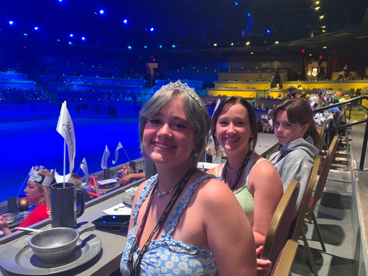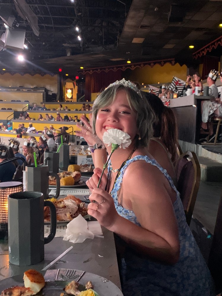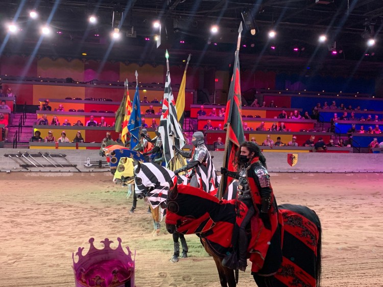 As the “feast” was served, we slurped our soup and tore into our chicken (utensils are optional), simultaneously cheering for our knight as he fiercely battled for the championship. And while the skirmishes are staged (obviously), the equestrianism skills demonstrated are spectacular, providing a great evening of wholesome, family friendly entertainment. To top it off, Annabelle, who insisted on wearing a crown, was personally handed a flower by the Black and White Knight. She grinned ear-to-ear the rest of the evening.