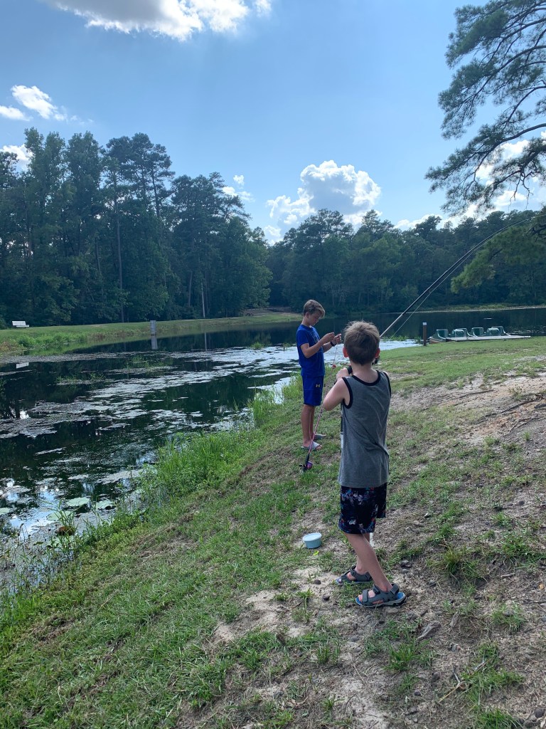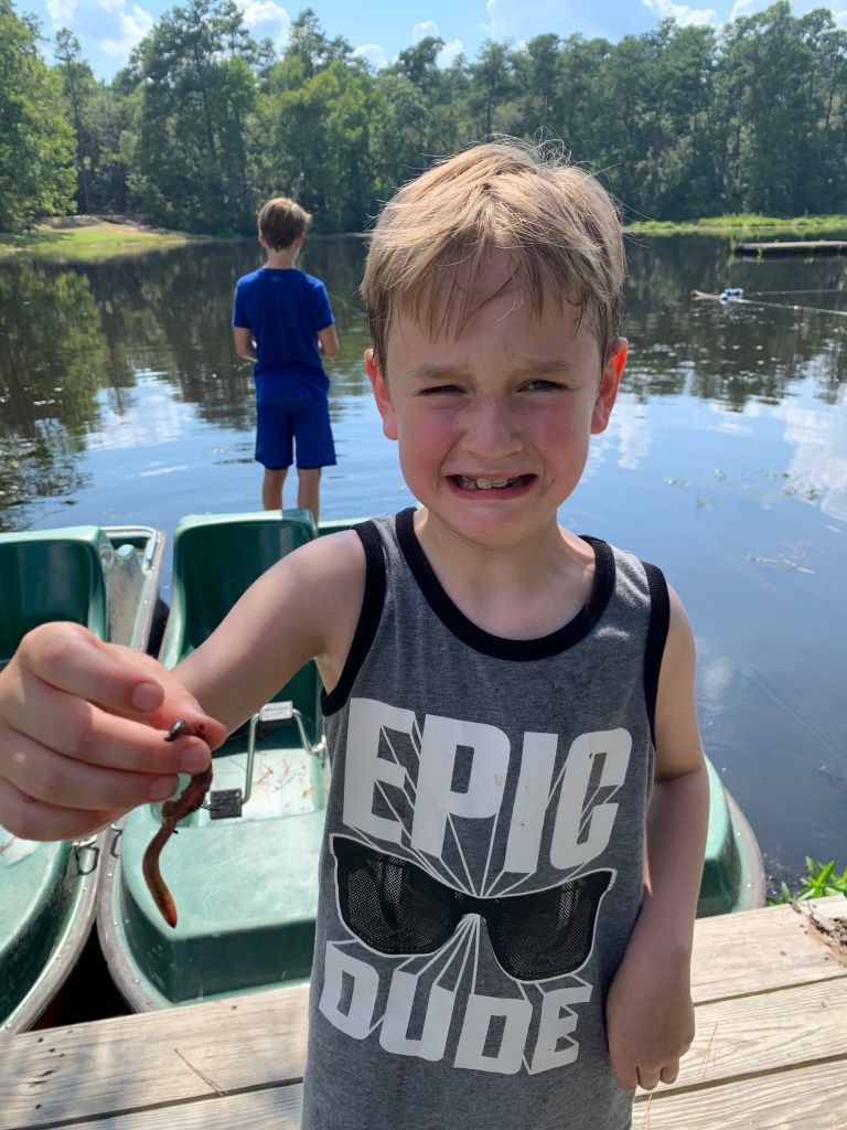 So often a few days without schedules and plans is exactly what the body needs. We slept in, stayed up late, and enjoyed catching up with family. We tried our hand, I mean…foot, at paddle boating, staying clear of the resident alligator who makes its home at the other end of the lake. The boys made a valiant attempt at fishing, but the blue gills were sneaky and quick. Worm after worm was baited, only to be snatched off the hook before the boys could reel up a catch.