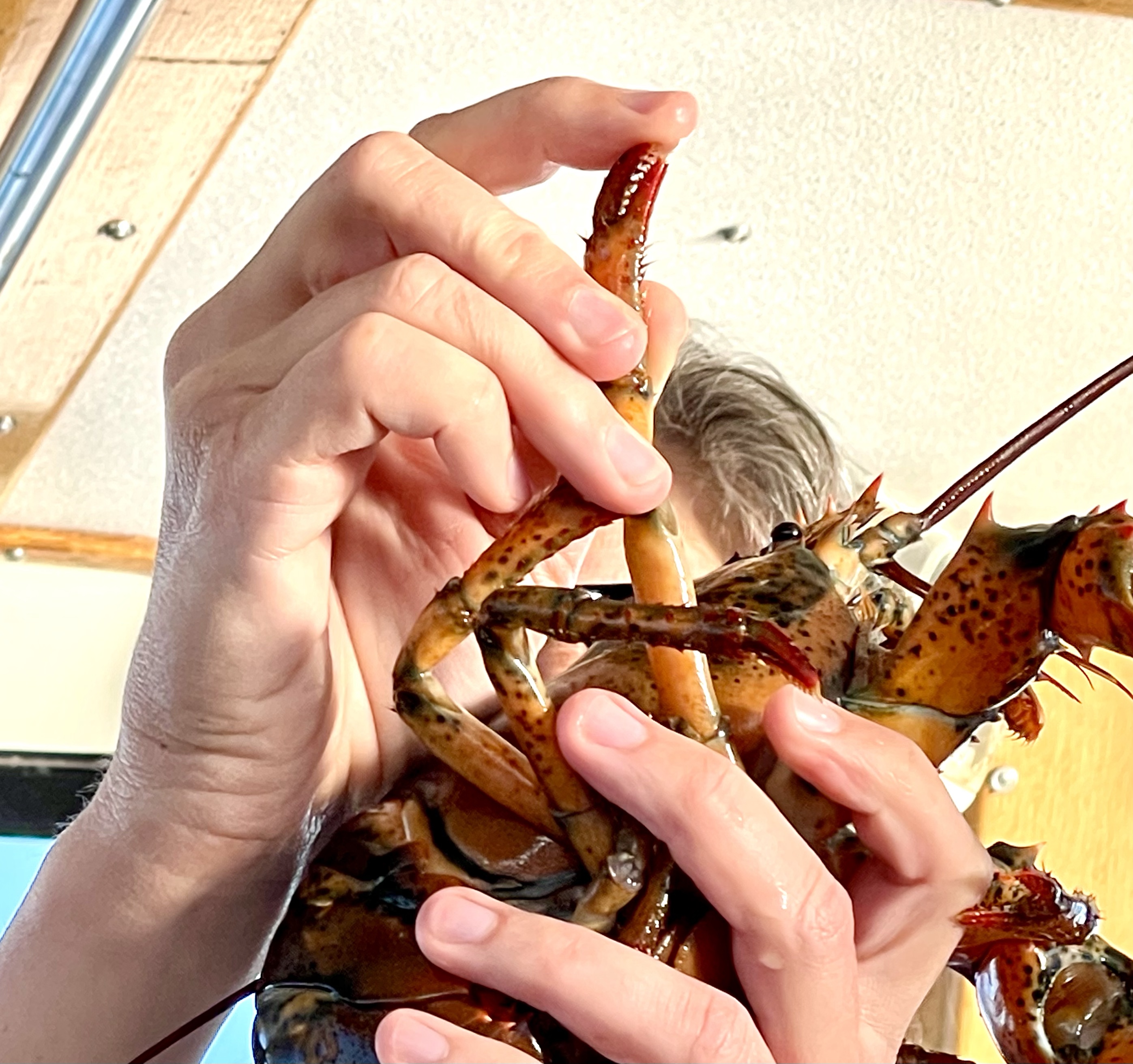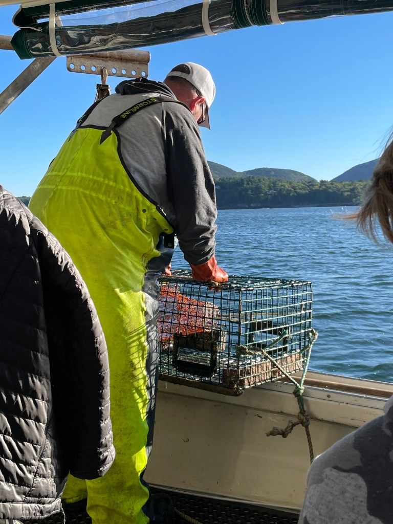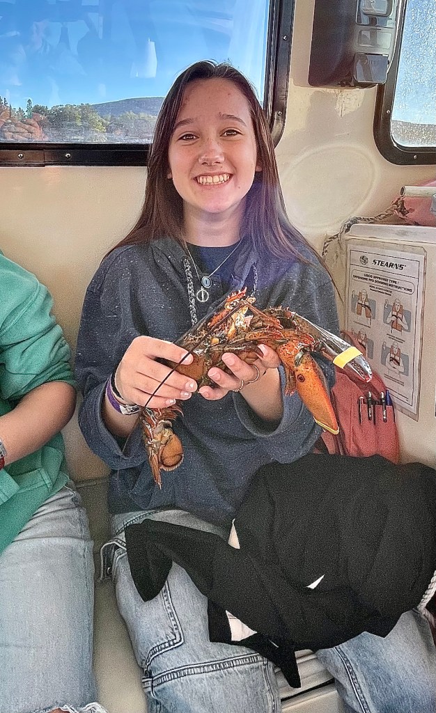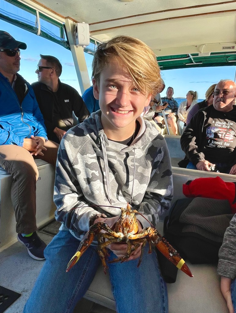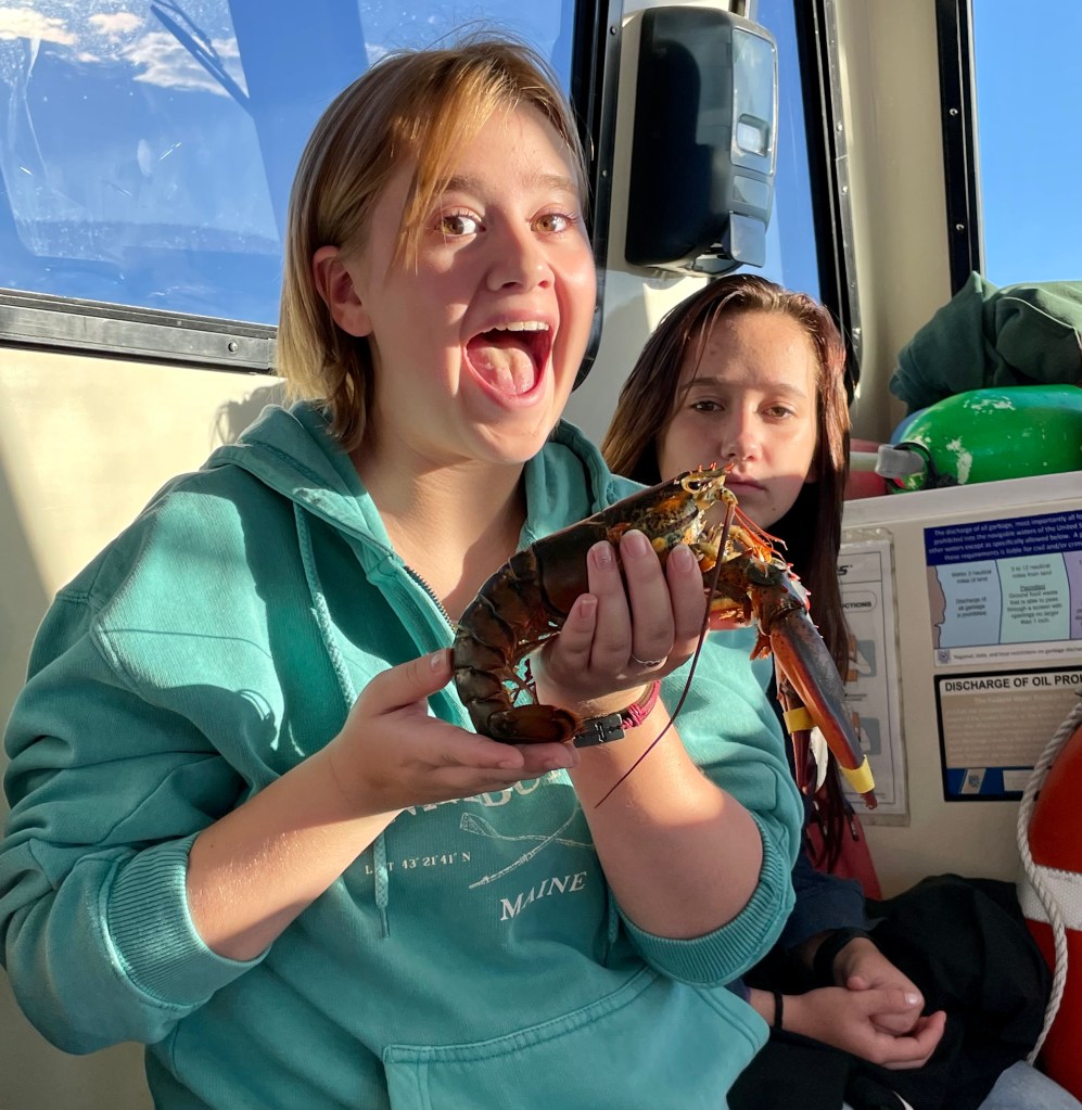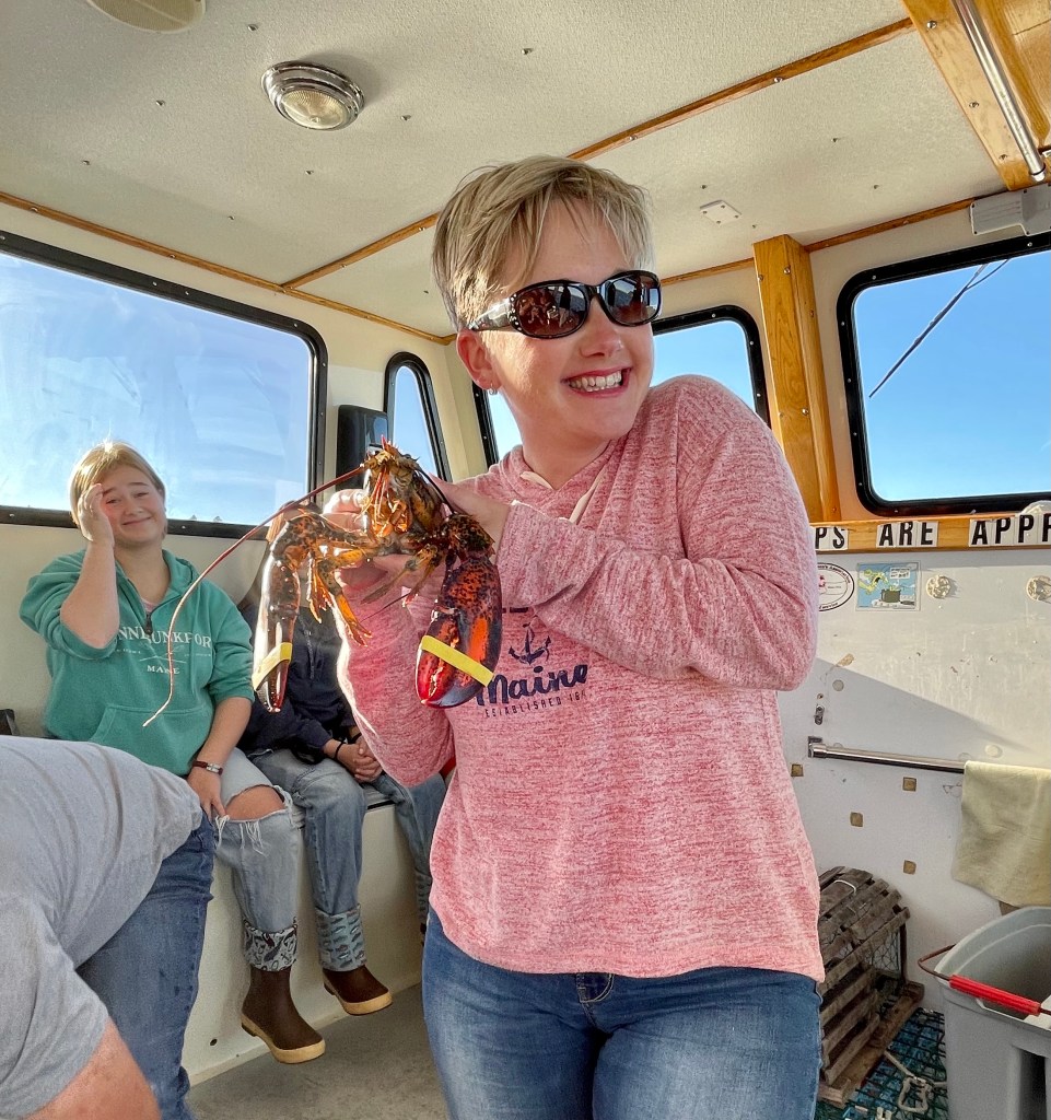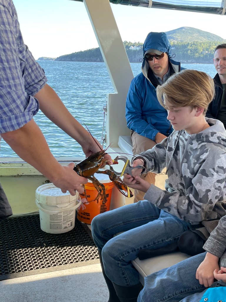 Once off the mountain, we found a parking spot in the bustling downtown area and set off for the harbor. Since we were running a few minutes late, we were the last to board the Lulu Lobster Boat, but still got front row seats! We thought, “What great luck!” until informed of the danger of our proximity: lobsters pee out of their eye sockets! Our seats came with a chance of being victims of crustacean harassment!