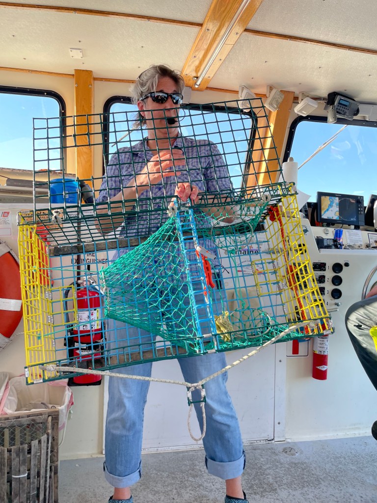 As the captain navigated us through the bay, our guide gave us the grand tour of lobster traps. Did you know traps have a kitchen? And a parlor room? That’s right, the bait, you guessed it, goes in the kitchen. The lobster crawls through the entrance and into the kitchen to feast on dinner, afterwards making its way to the parlor to relax. Apparently, they are also very picky eaters, eating only the freshest of cuisine. (They have little hairs on their legs which they use to taste their food). However, they aren’t too bright. The traps have escape hatches, with nothing keeping the lobster inside the basket. So when the trap is pulled out of the water, it’s only the dumb ones that make it to your dinner plate.