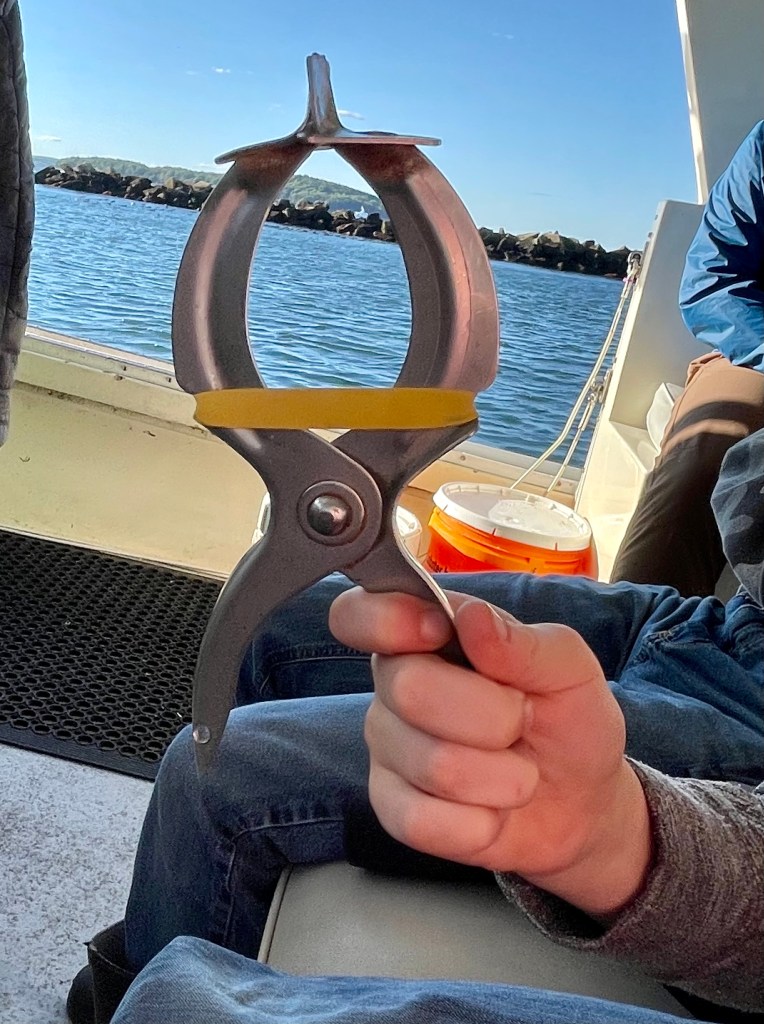 As our boat pulled up to its specific wooden buoy, the lobsterman prepared the electronic pulley and within seconds the trap was propped on the ledge. Reaching in, he retrieved two lobsters. Ben and Sam both got to try their hand at disarming the lobsters by using a special tool that slides rubber-bands over each claw. Then Abby and Annabelle had the difficult task of deciding whether they were keepers or would be returned back to their watery homes. Fortunately, both met size requirements and we, in turn, got a little lesson in lobster anatomy.