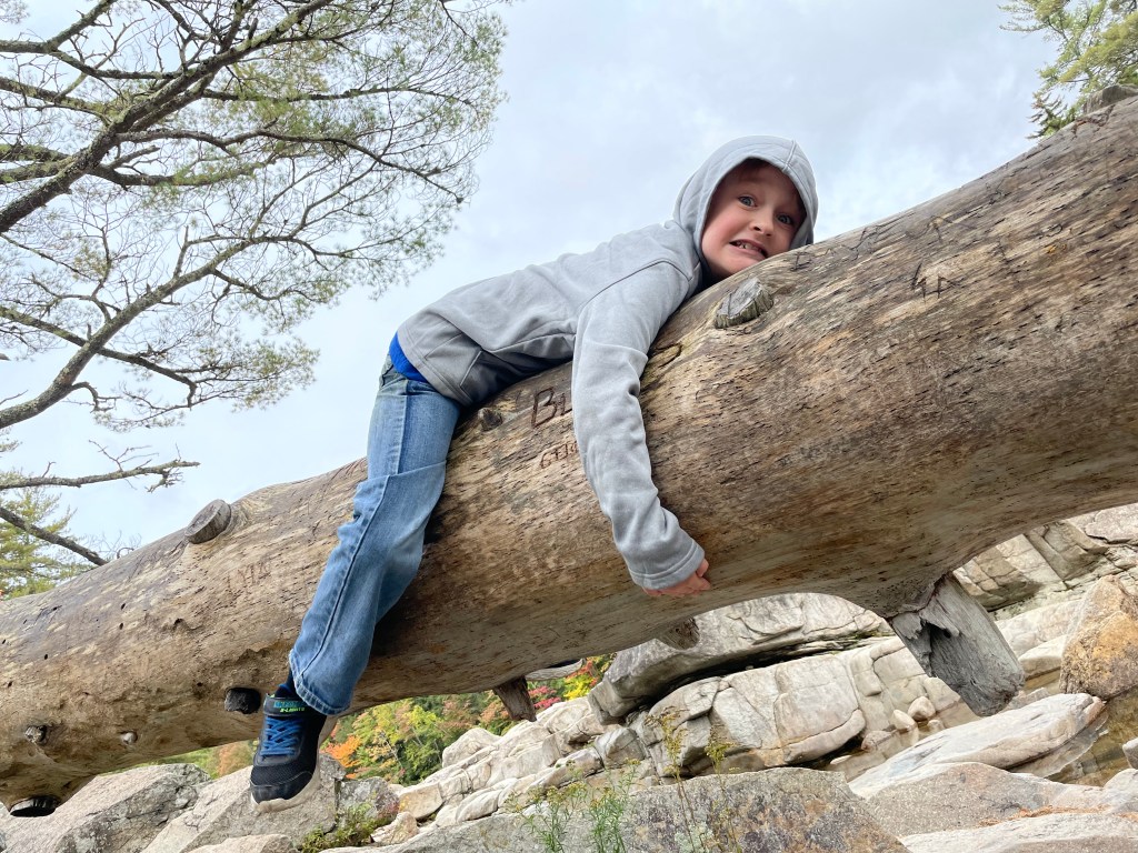 After reluctantly saying our goodbyes to Sabbaday Falls, we hit a few other highlights as the miles of The Kanc quickly dwindled. The kids scrambled up cragged boulders and jumped across smooth-flowing riverbanks. Meanwhile, Dave and I breathed in the relaxing views of picturesque covered bridges not to be outdone by splashes of vibrant colors sprinkled along the rocky banks.