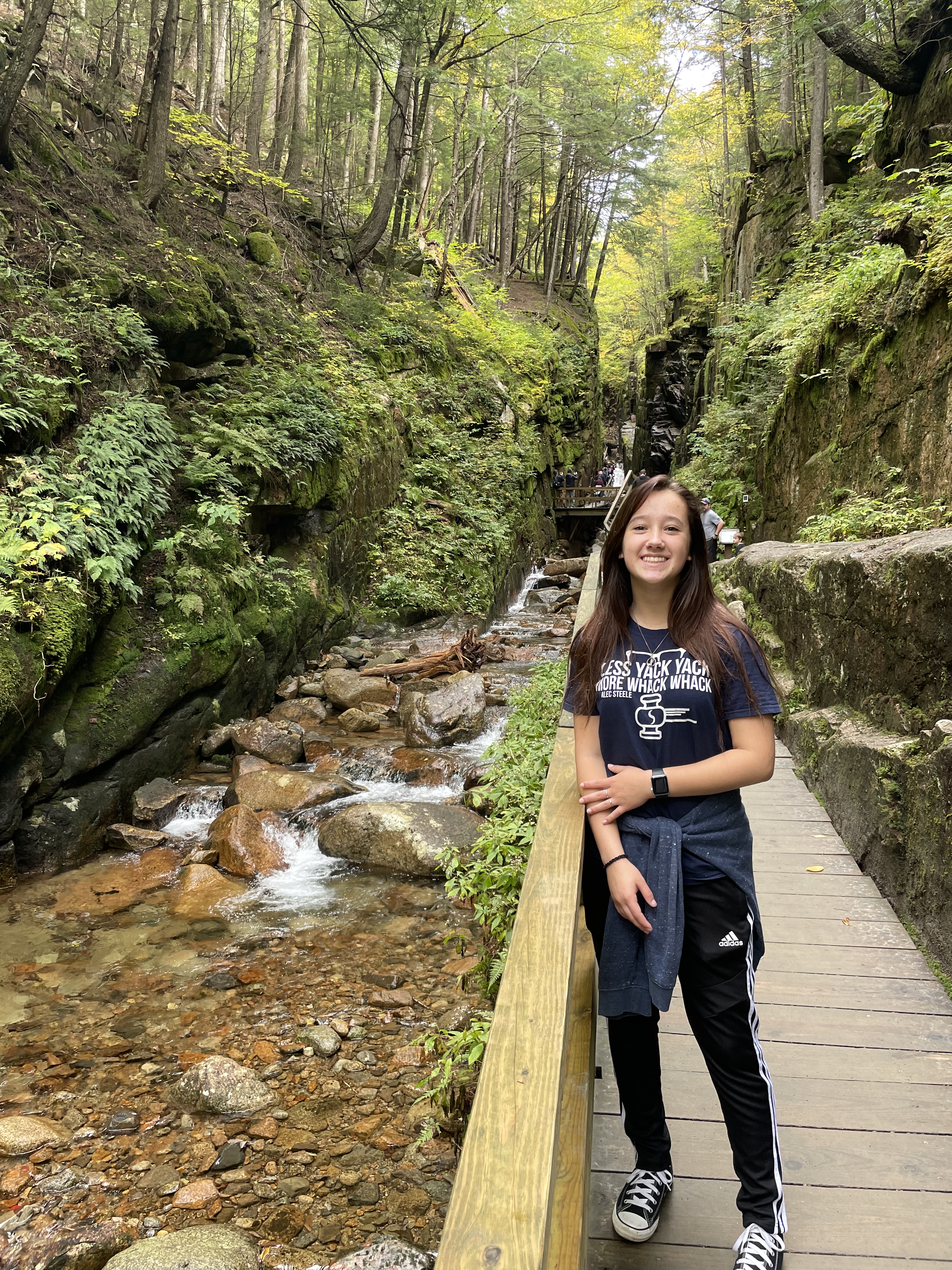 The Flume was like buying tickets to the IMAX where the theater comes alive, as the bass rattles your seat and the characters jump off the screen…except even better. While we journeyed down the 2-mile path (1.5 hours), we marveled at the lush green beauty, as spray from the waterfalls dripped off the clinging moss. We experienced nature in it’s all-encompassing “Dolby Digital™️ Surround Sound” as twigs snapped, birds chirped, and waters cascaded down hillsides. But my favorite part was the smell of the woods. There is nothing quite like the aroma of pine and soil mixed together with fallen leaves and autumn air. If only Bath and Body Works™️ could figure out the formula and bottle it, I’d buy it by the caseloads.