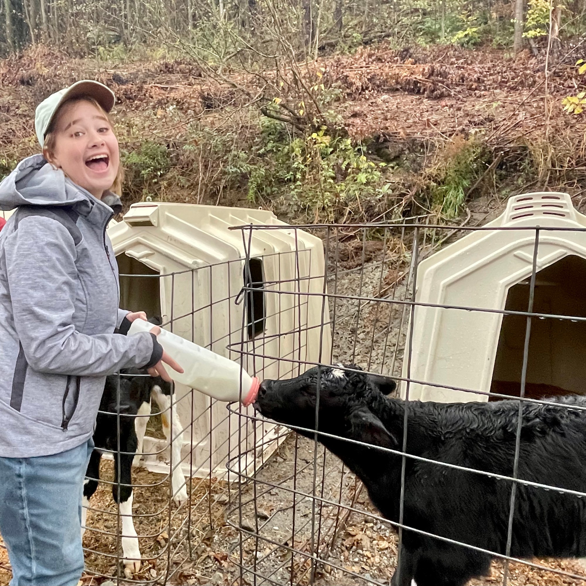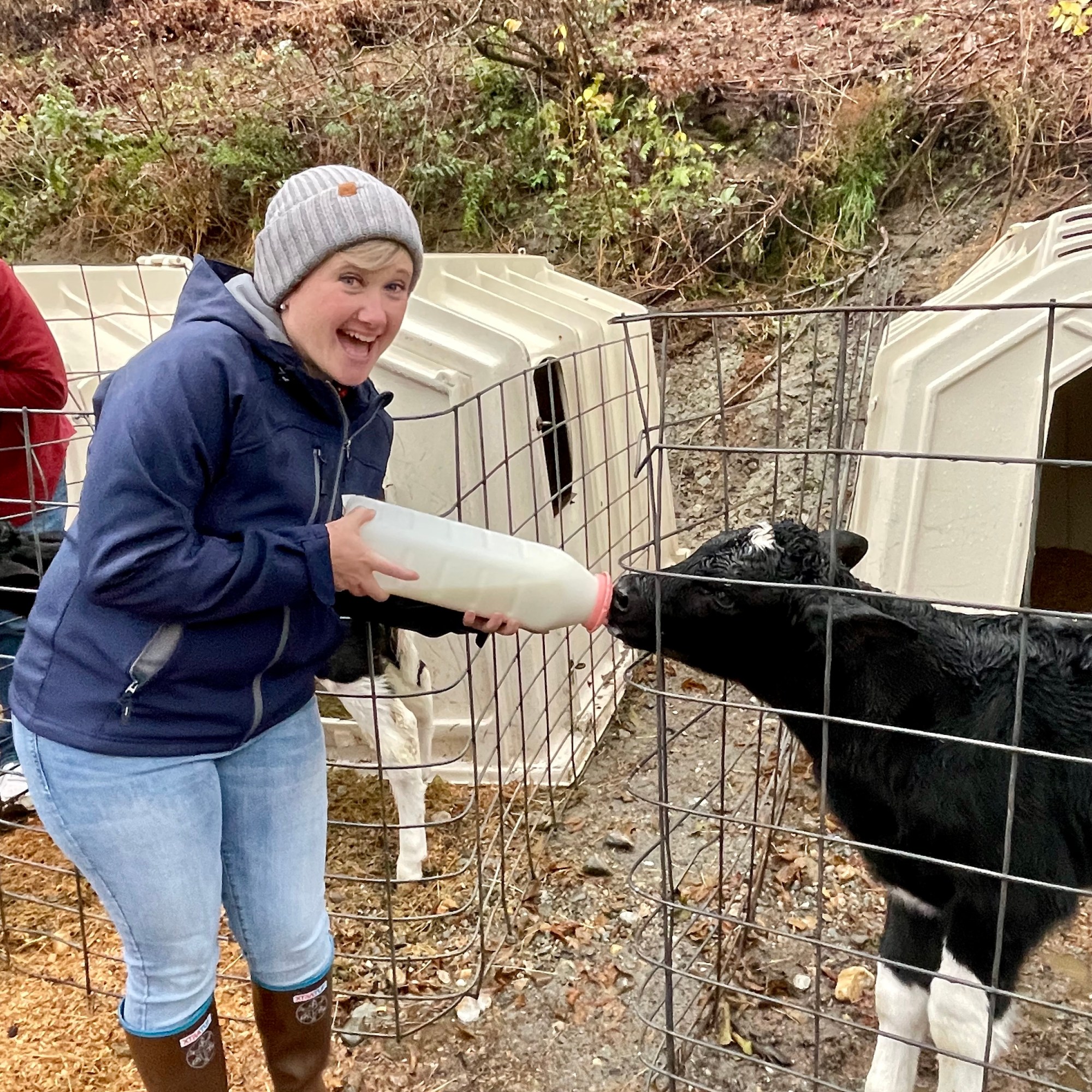 Upon exiting the barn, we then made a beeline for a row of roughly 20 pens, each holding a young calf, not more than a couple days old. Feeding time had just begun and a frenzied and impatient ”MOO-ing” could be heard from almost every pen. Gigantic baby bottles, each containing 2 quarts of milk, were distributed among the guests. For the next 45 minutes we had the ”utter” pleasure of bottle-feeding those adorable four-legged babes. Each little calf sucked down its breakfast like it was a few meager ounces, except for one that had to be coaxed. But that’s ok, he was a newbie and quickly got the hang of it.
