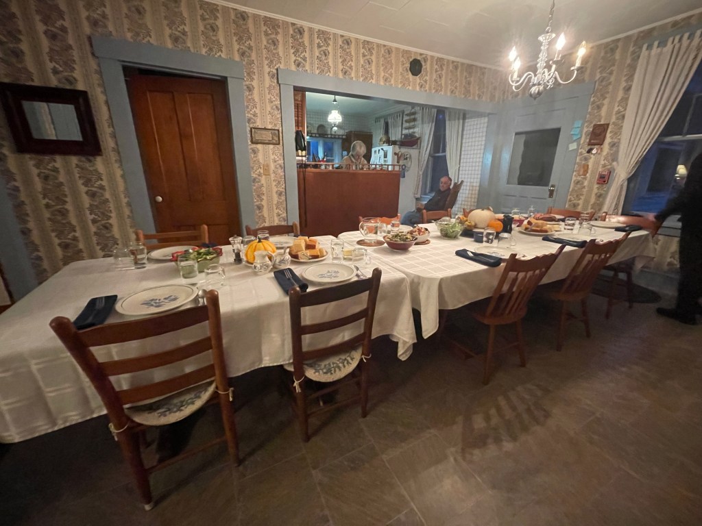 Luggage in hand, we stepped onto the wide front porch of the picture-perfect farmhouse, framed by black wooden shutters and a silvery, old tin roof. Once inside we were greeted by Bob and Beth, Bob in his recliner and Beth cheerfully buzzing around the kitchen with dinner preparations nearing an end. We were shown to our rooms on the other side of the inn, the kids setting up in the yellow and blue floral room with four beds, and Dave and I across the hall in the white and blue wallpapered bedroom.