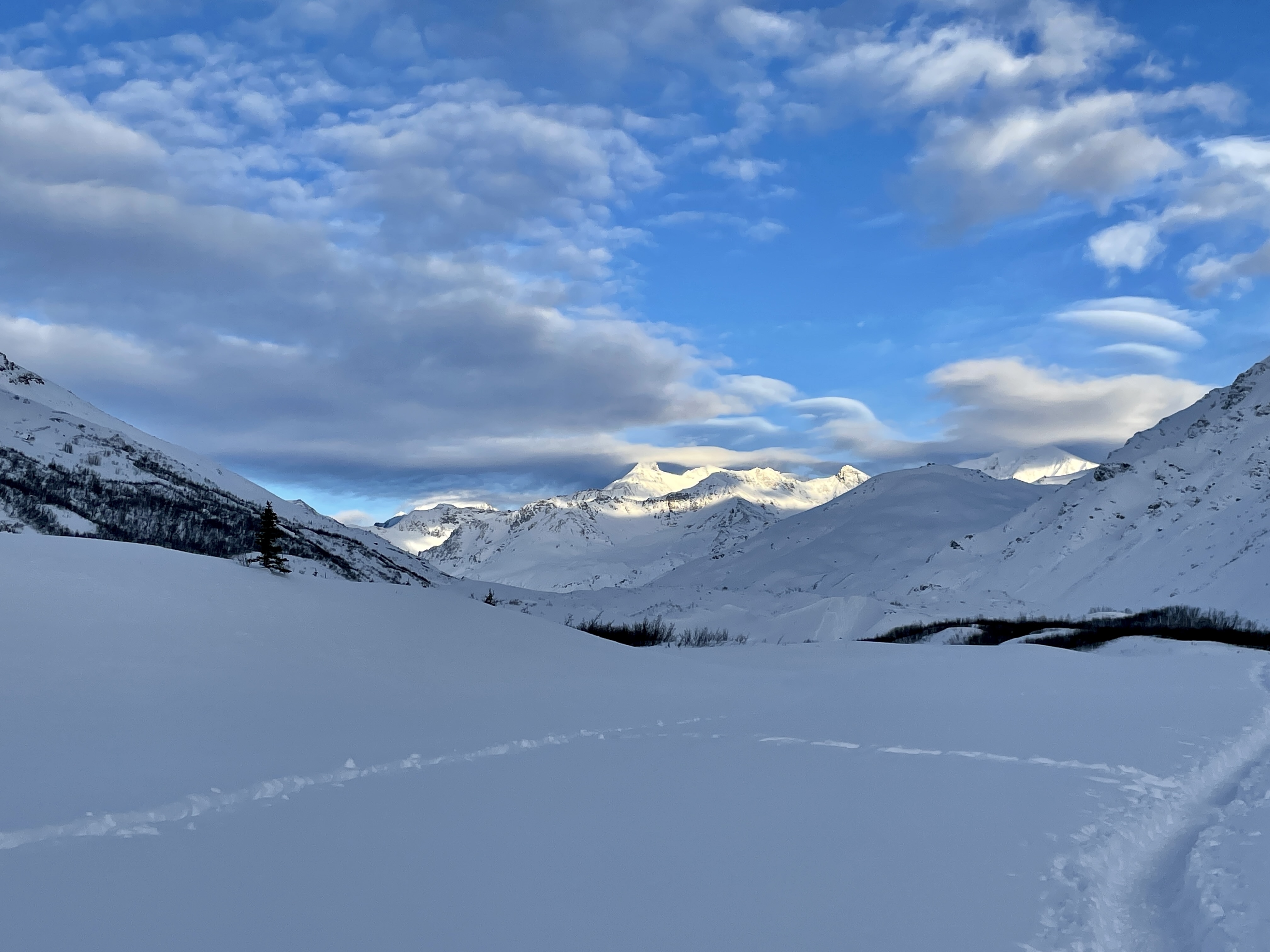 As with every destination in Alaska, this escapade yet again required quite the drive, but I was hopeful it would be worth every gallon of gas spent! However, because we had been staying up late hunting Lady Aurora, we slept in, not getting on the road until after 1 p.m. Already slightly nervous about hiking into seemingly nowhere to some mythical cave, my concerns grew as the winds picked up, creating white-out conditions. As my imagination prevailed over my more sensible self, headlines began to scroll through my mind, “Missouri Hikers Freeze to Death While Searching for Rumored Ice Cave,” or “Bodies of Missouri Parents Found Dead In The Alaskan Wilderness.” Despite being dressed in thermal layers, outer gear, hand warmers, heated socks (my Christmas present from Sam), and ice cleats, I mentally decided it wasn’t worth the risk and we should turn back. Yet upon arriving at Richardson Highway’s milepost 217.3, the starting point for our hike, the wind had ceased and a crude parking lot was brimming with cars!
