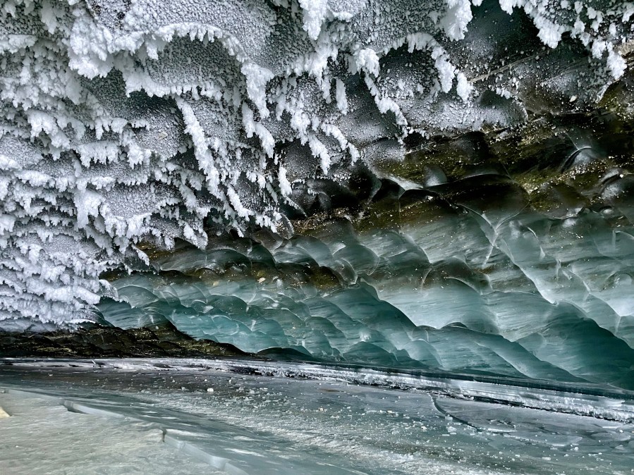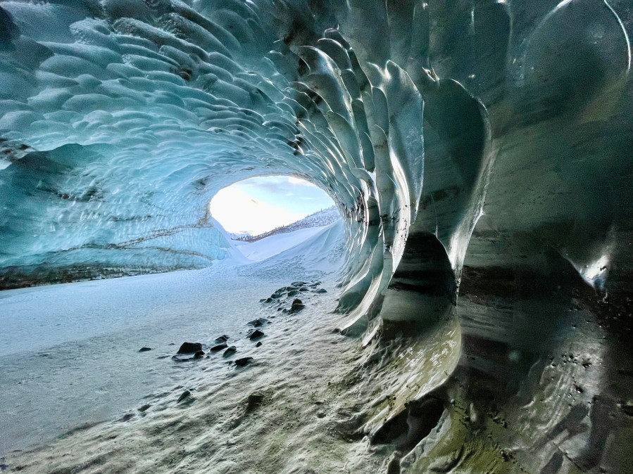 Not only was the trail easy to follow despite the deep snow, but per Alaska’s usual, it was surrounded by 360º of nature’s majesty. I was thankful for the scattered hikers coming to and fro creating a frame of reference for where the opening of the cave was located. Trying to savor every moment, we slow-go’d our walk, taking about 45 minutes before finally arriving at the entrance. Unassuming from the outside, the mouth was roughly 50 feet tall by 40 feet wide. But as we walked inside, the magic began.