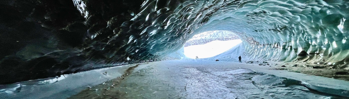Not only was the trail easy to follow despite the deep snow, but per Alaska’s usual, it was surrounded by 360º of nature’s majesty. I was thankful for the scattered hikers coming to and fro creating a frame of reference for where the opening of the cave was located. Trying to savor every moment, we slow-go’d our walk, taking about 45 minutes before finally arriving at the entrance. Unassuming from the outside, the mouth was roughly 50 feet tall by 40 feet wide. But as we walked inside, the magic began.